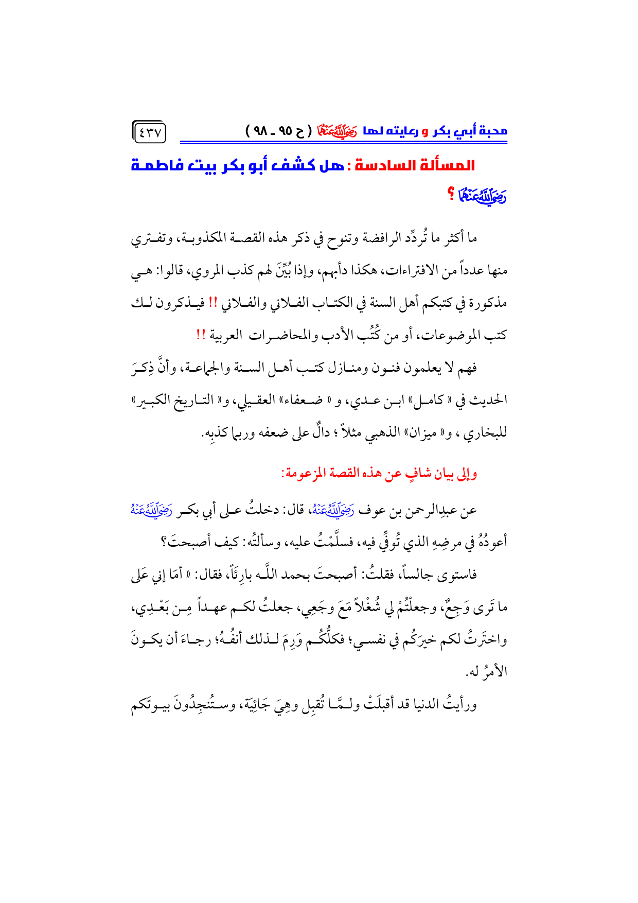 المسألة السادسة: هل كشف أبو بكر بيت فاطمة - رضي الله عنهما -؟