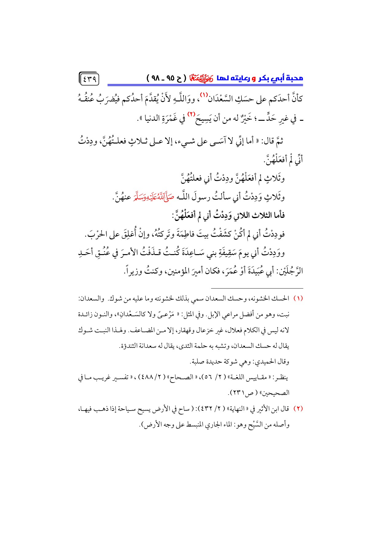 ثمَّ قال: «أما إنِّي لا آسَى على شيء، إلا على ثلاثٍ فعلتُهُنَّ، ودِدْتُ أنِّي لْم أفعَلْهُنَّ.