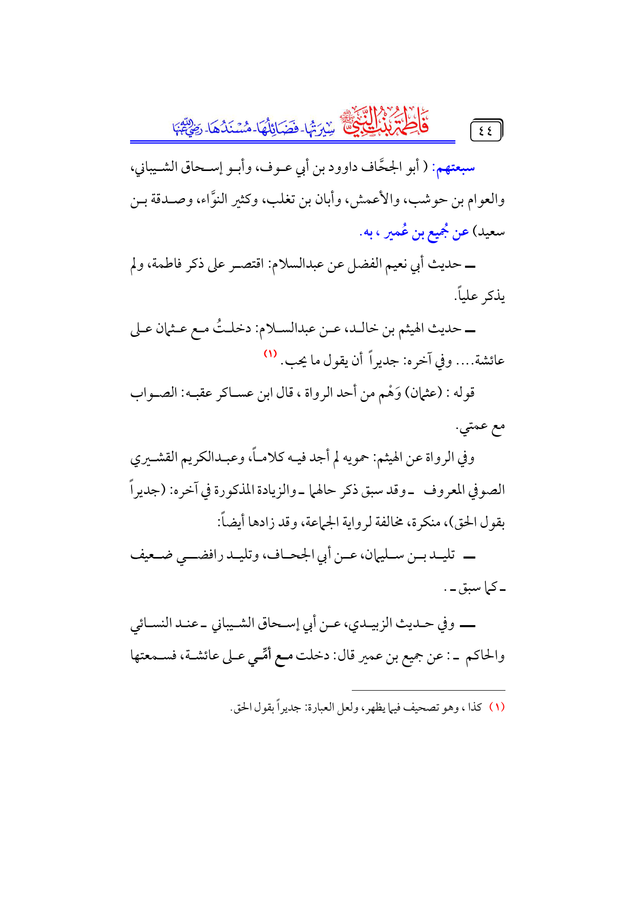 ــ حديث الهيثم بن خالد، عن عبدالسلام: دخلتُ مع عثمان على عائشة .... وفي آخره: جديراً أن يقول ما يحب. (¬١)