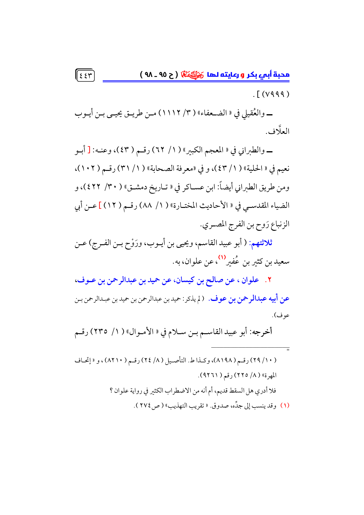 ثلاثتهم: (أبو عبيد القاسم، ويحيى بن أيوب، ورَوْح بن الفرج) عن سعيد بن كثير بن عُفير (¬١)، عن علوان، به.