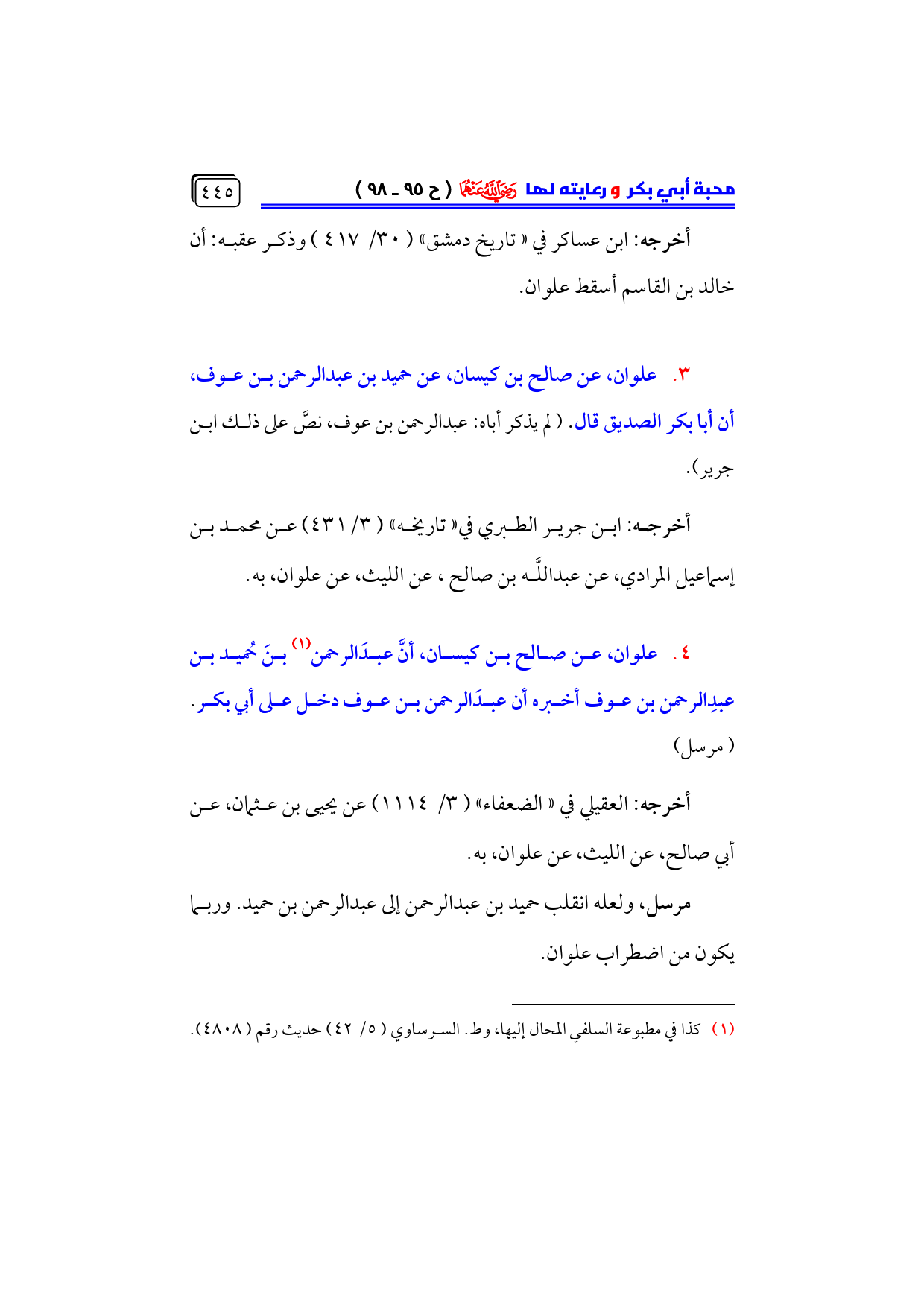٣. علوان، عن صالح بن كيسان، عن حميد بن عبدالرحمن بن عوف، أن أبا بكر الصديق قال. (لم يذكر أباه: عبدالرحمن بن عوف، نصَّ على ذلك ابن جرير).