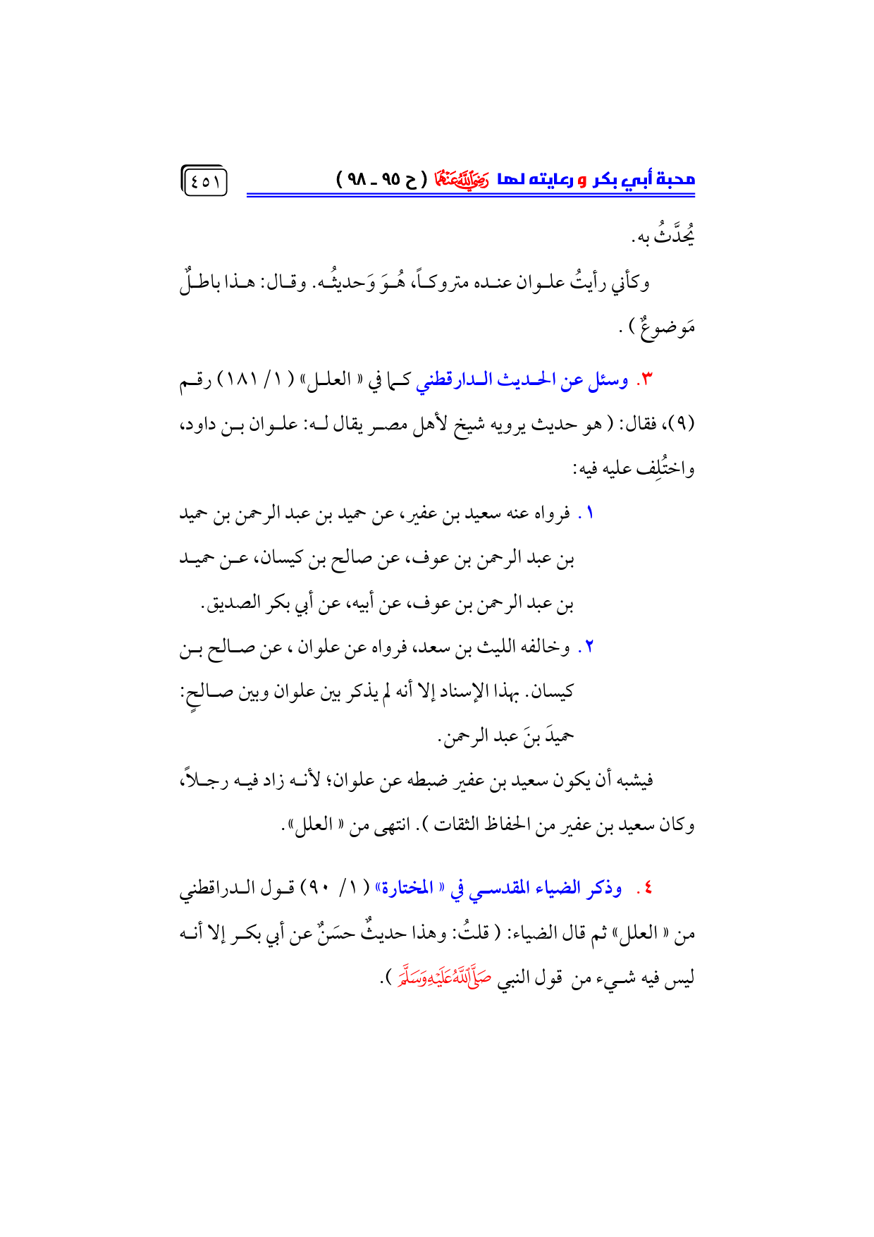 ٤. وذكر الضياء المقدسي في «المختارة» (١/ ٩٠) قول الدراقطني من «العلل» ثم قال الضياء: (قلتُ: وهذا حديثٌ حسَنٌ عن أبي بكر إلا أنه ليس فيه شيء من قول النبي - صلى الله عليه وسلم -).