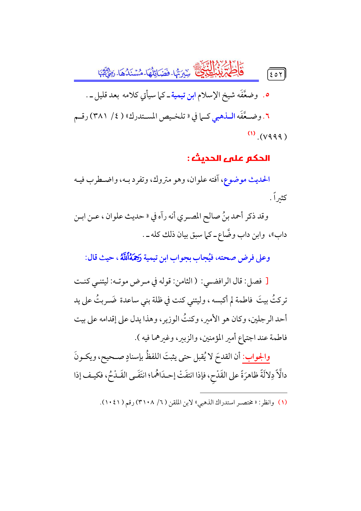 كتاب فاطمة بنت النبي - صلى الله عليه وسلم - سيرتها، فضائلها، مسندها - رضي الله عنها - (اسم الجزء: 4)