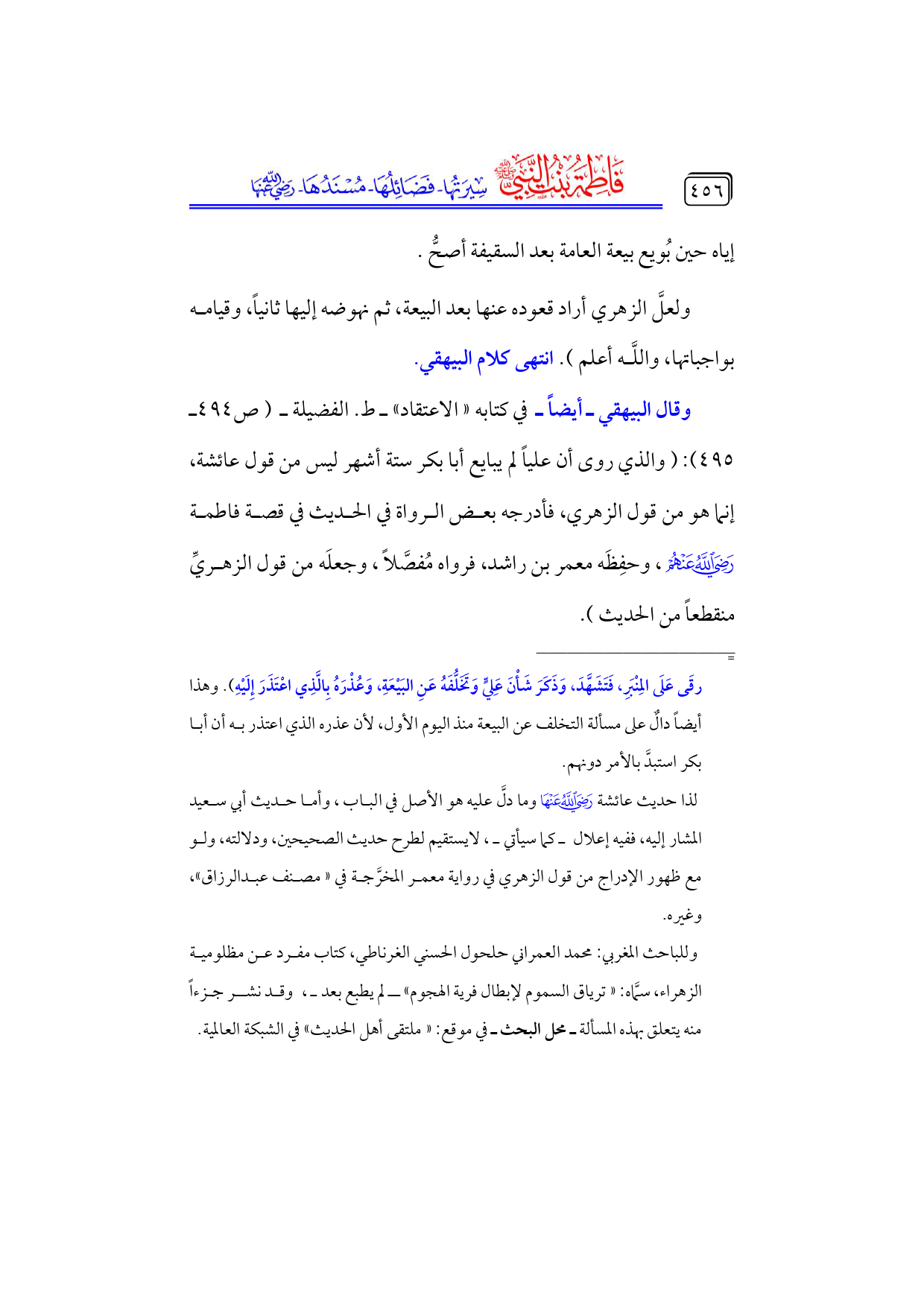 وقال البيهقي ـ أيضاً ـ في كتابه «الاعتقاد» ـ ط. الفضيلة ـ (ص ٤٩٤ ـ ٤٩٥): (والذي روى أن علياً لم يبايع أبا بكر ستة أشهر ليس من قول عائشة، إنما هو من قول الزهري، فأدرجه بعض الرواة في الحديث في قصة فاطمة - رضي الله عنهم -، وحفِظَه معمر بن راشد، فرواه مُفصَّلاً، وجعلَه من قول الزهريِّ منقطعاً من الحديث).