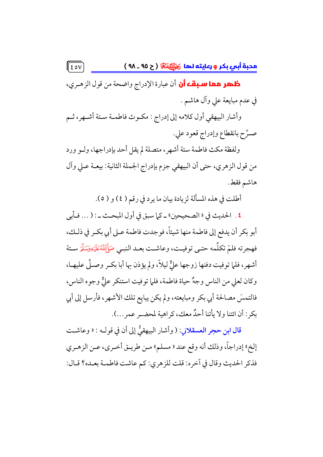 ولفظة مكث فاطمة ستة أشهر، متصلة لم يقل أحد بإدراجها، ولو ورد من قول الزهري، حتى أن البيهقي جزم بإدراج الجملة الثانية: بيعة علي وآل هاشم فقط.