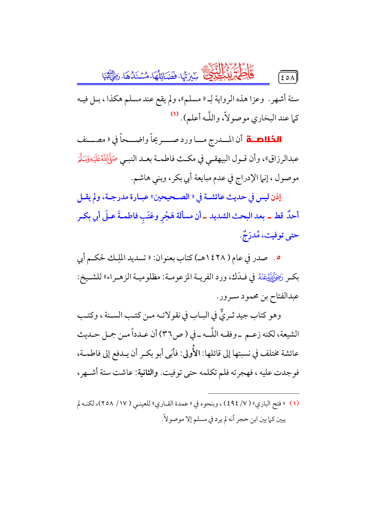 الخلاصة أن المدرج ما ورد صريحاً واضحاً في «مصنف عبدالرزاق»، وأن قول البيهقي في مكث فاطمة بعد النبي - صلى الله عليه وسلم - موصول، إنما الإدراج في عدم مبايعة أبي بكر، وبني هاشم.