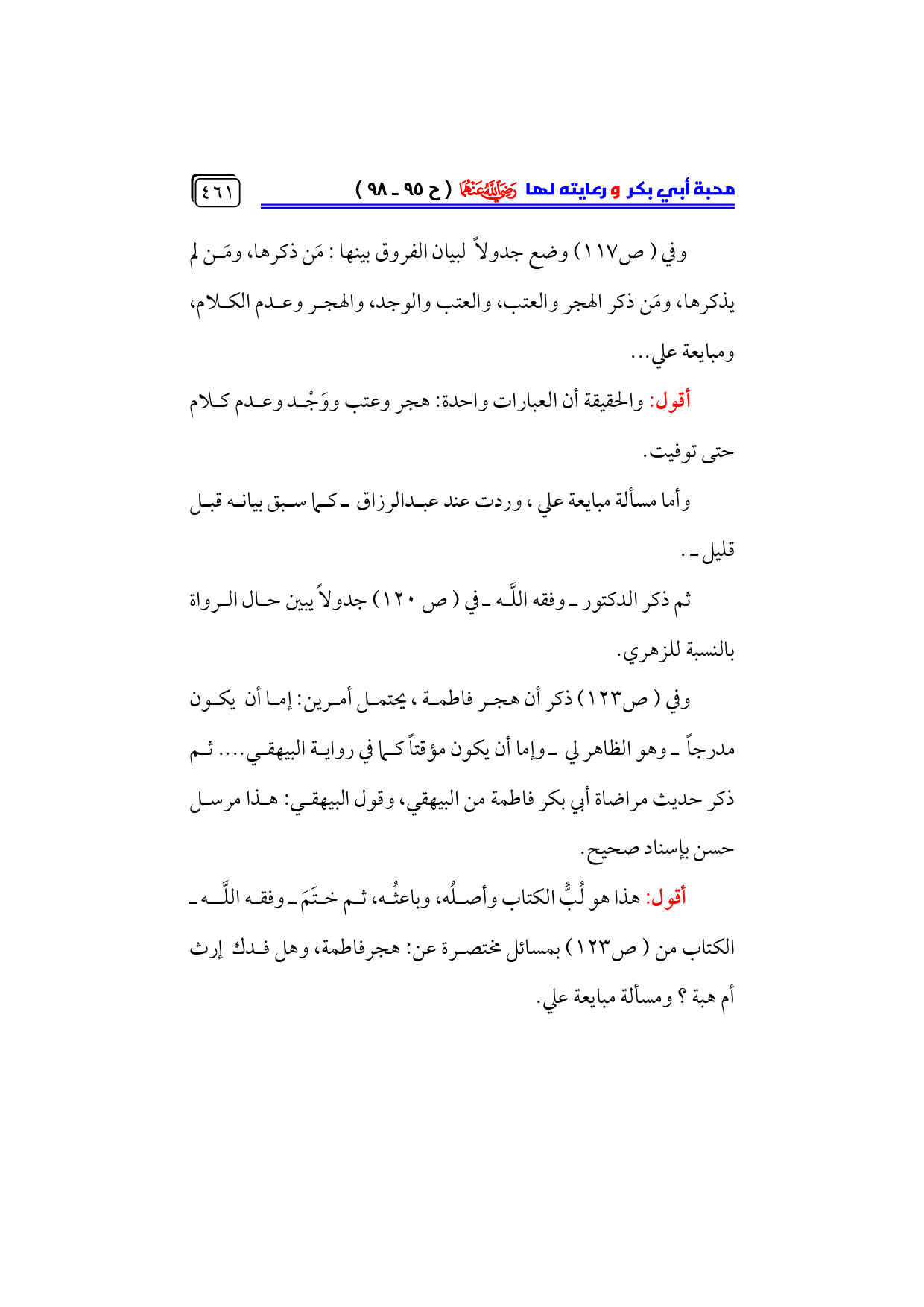 وفي (ص ١٢٣) ذكر أن هجر فاطمة، يحتمل أمرين: إما أن يكون مدرجاً ـ وهو الظاهر لي ـ وإما أن يكون مؤقتاً كما في رواية البيهقي .... ثم ذكر حديث مراضاة أبي بكر فاطمة من البيهقي، وقول البيهقي: هذا مرسل حسن بإسناد صحيح.
