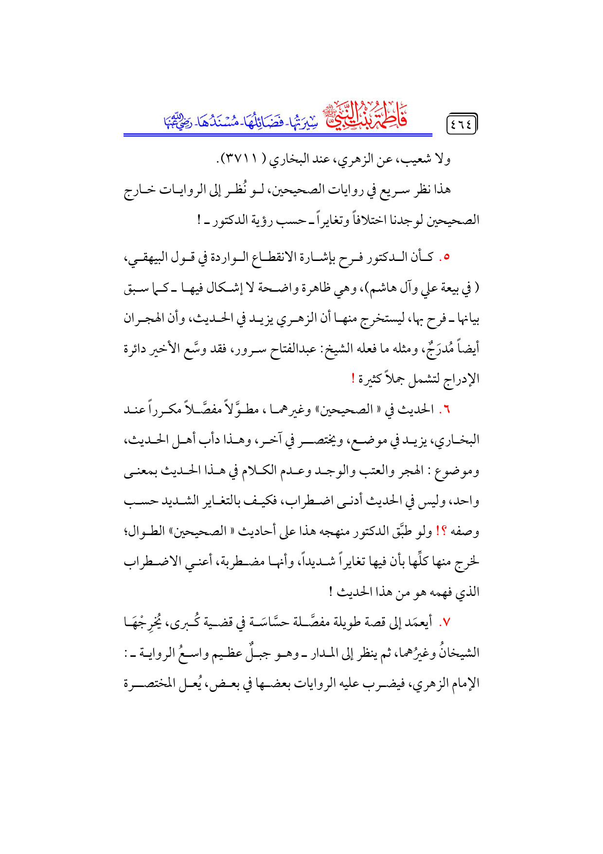 ٥. كأن الدكتور فرح بإشارة الانقطاع الواردة في قول البيهقي، ... (في بيعة علي وآل هاشم)، وهي ظاهرة واضحة لا إشكال فيها ـ كما سبق بيانها ـ فرح بها، ليستخرج منها أن الزهري يزيد في الحديث، وأن الهجران أيضاً مُدرَجٌ، ومثله ما فعله الشيخ: عبدالفتاح سرور، فقد وسَّع الأخير دائرة الإدراج لتشمل جملاً كثيرة!