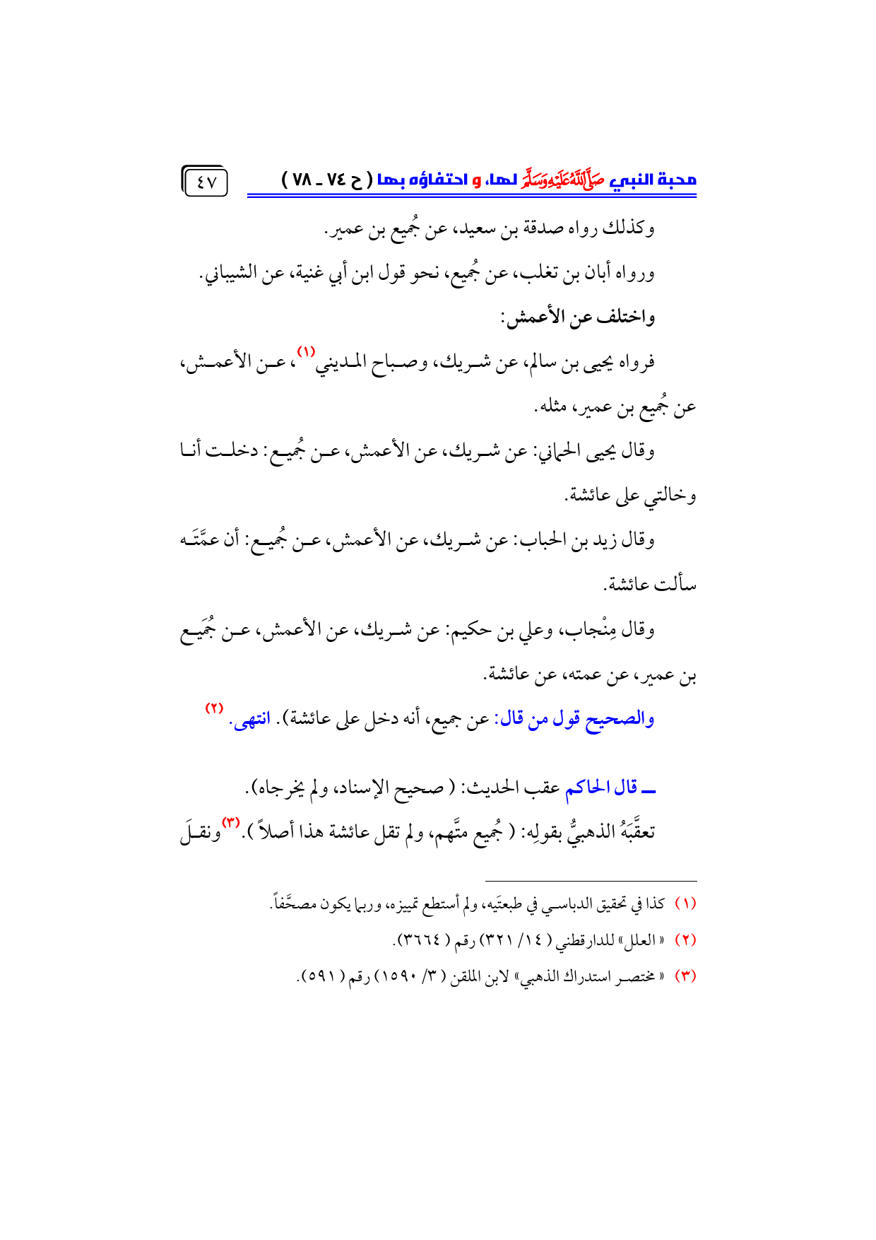 تعقَّبَهُ الذهبيُّ بقولِه: (جُميع متَّهم، ولم تقل عائشة هذا أصلاً). (¬٣) ونقلَ