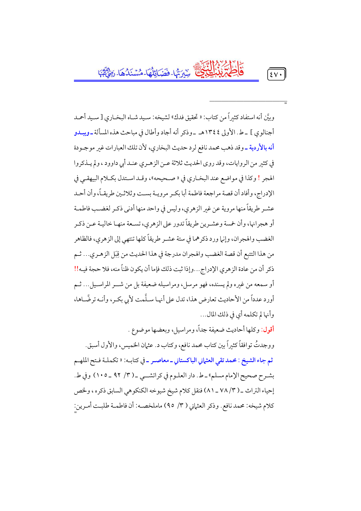 = وبيَّن أنه استفاد كثيراً من كتاب: «تحقيق فدك» لشيخه: سيد شاه البخاري [سيد أحمد أجنالوي]ـ ط. الأولى ١٣٤٤ هـ ـ وذكر أنه أجاد وأطال في مباحث هذه المسألة ـ ويبدو أنه بالأردية ـ وقد ذهب محمد نافع لرد حديث البخاري، لأن تلك العبارات غير موجودة في كثير من الروايات، وقد روى الحديث ثلاثة عن الزهري عند أبي داوود، ولم يذكروا الهجر! وكذا في مواضع عند البخاري في «صحيحه»، وقد استدل بكلام البيهقي في الإدراج، وأفاد أن قصة مراجعة فاطمة أبا بكر مروية بست وثلاثين طريقاً، وأن أحد عشر طريقاً منها مروية عن غير الزهري، وليس في واحد منها أدنى ذكر لغضب فاطمة أو هجرانها، وأن خمسة وعشرين طريقاً تدور على الزهري، تسعة منها خالية عن ذكر الغضب والهجران، وإنما ورد ذكرهما في ستة عشر طريقاً كلها تنتهي إلى الزهري، فالظاهر من هذا التتبع أن قصة الغضب والهجران مدرجة في هذا الحديث من قِبَل الزهري ... ثم ذكر أن من عادة الزهري الإدراج ... وإذا ثبت ذلك فإما أن يكون ظناً منه، فلا حجة فيه! ! أو سمعه من غيره ولم يسنده، فهو مرسل، ومراسيله ضعيفة بل من شر المراسيل ... ثم أورد عدداً من الأحاديث تعارض هذا، تدل على أنها سلَّمت لأبي بكر، وأنه ترضَّاها، وأنها لم تكلمه أي في ذلك المال ...