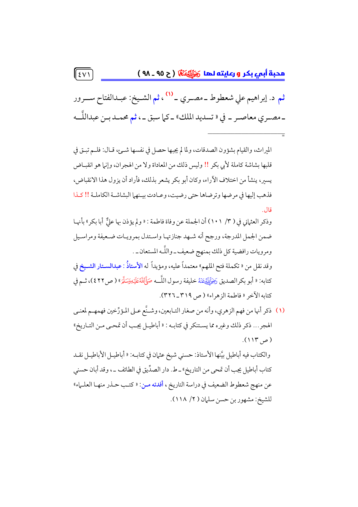 وذكر العثماني في (٣/ ١٠١) أن الجملة عن وفاة فاطمة: «ولم يؤذن بها عليٌّ أبا بكر» بأنها ضمن الجمل المدرجة، ورجح أنه شهد جنازتها واستدل بمرويات ضعيفة ومراسيل ومرويات رافضية كل ذلك بمنهج ضعيف ـ واللَّه المستعان ـ.