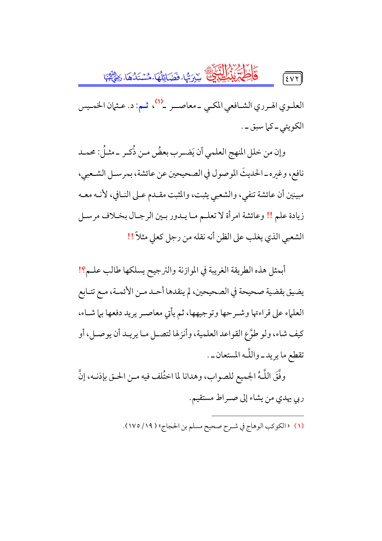 أبمثل هذه الطريقة الغريبة في الموازنة والترجيح يسلكها طالب علم؟ ! ... يضيق بقضية صحيحة في الصحيحين، لم ينقدها أحد من الأئمة، مع تتابع العلماء على قراءتها وشرحها وتوجيهها، ثم يأتي معاصر يريد دفعها بما شاء، كيف شاء، ولو طوَّع القواعد العلمية، وأنزلها لتصل ما يريد أن يوصل، أو تقطع ما يريد ـ واللَّه المستعان ـ.