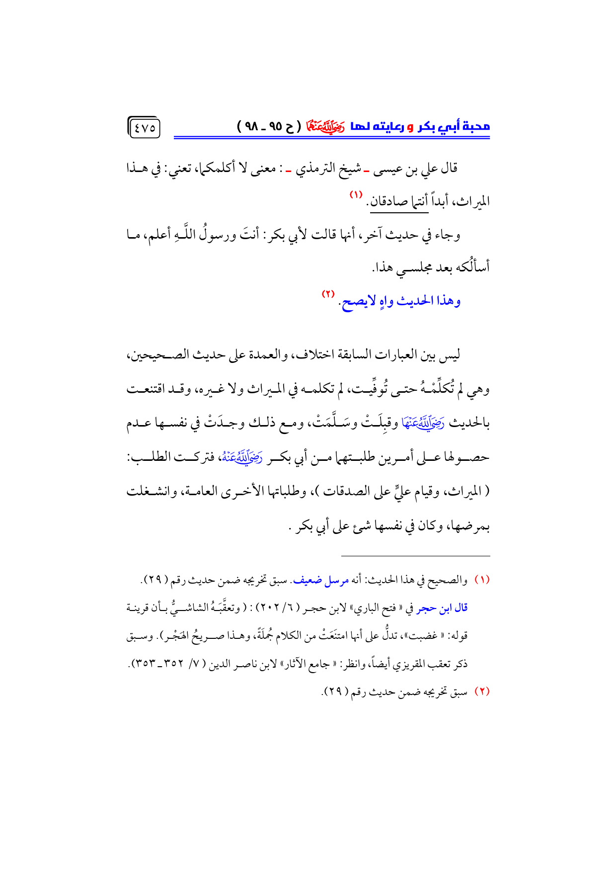 ليس بين العبارات السابقة اختلاف، والعمدة على حديث الصحيحين، وهي لم تُكلِّمْهُ حتى تُوفِّيت، لم تكلمه في الميراث ولا غيره، وقد اقتنعت بالحديث - رضي الله عنها - وقبِلَتْ وسَلَّمَتْ، ومع ذلك وجدَتْ في نفسها عدم حصولها على أمرين طلبتهما من أبي بكر - رضي الله عنه -، فتركت الطلب: ... (الميراث، وقيام عليٍّ على الصدقات)، وطلباتها الأخرى العامة، وانشغلت بمرضها، وكان في نفسها شئ على أبي بكر.