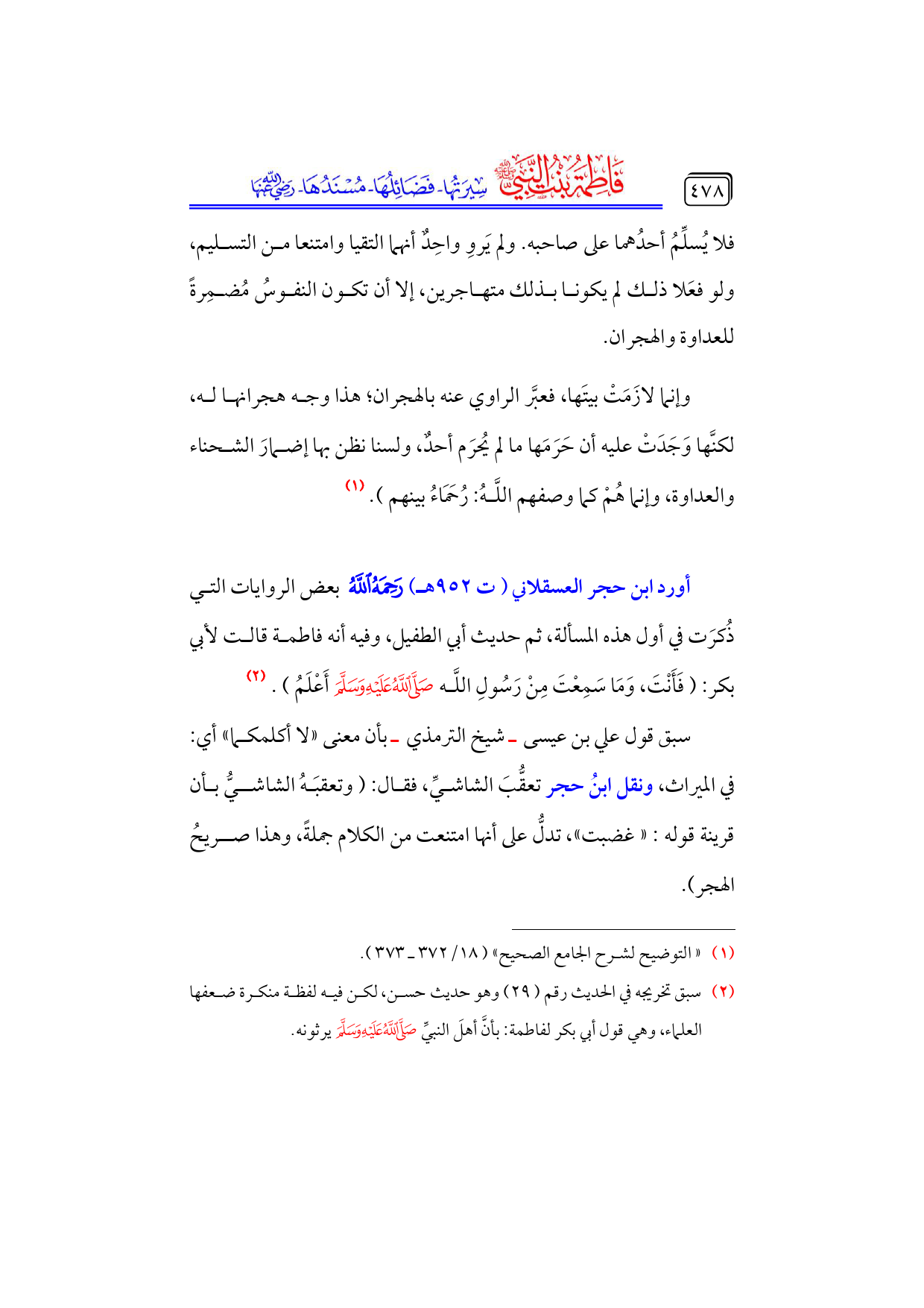 وإنما لازَمَتْ بيتَها، فعبَّر الراوي عنه بالهجران؛ هذا وجه هجرانها له، لكنَّها وَجَدَتْ عليه أن حَرَمَها ما لم يُحرَم أحدٌ، ولسنا نظن بها إضمارَ الشحناء والعداوة، وإنما هُمْ كما وصفهم اللَّهُ: رُحَمَاءُ بينهم). (¬١)