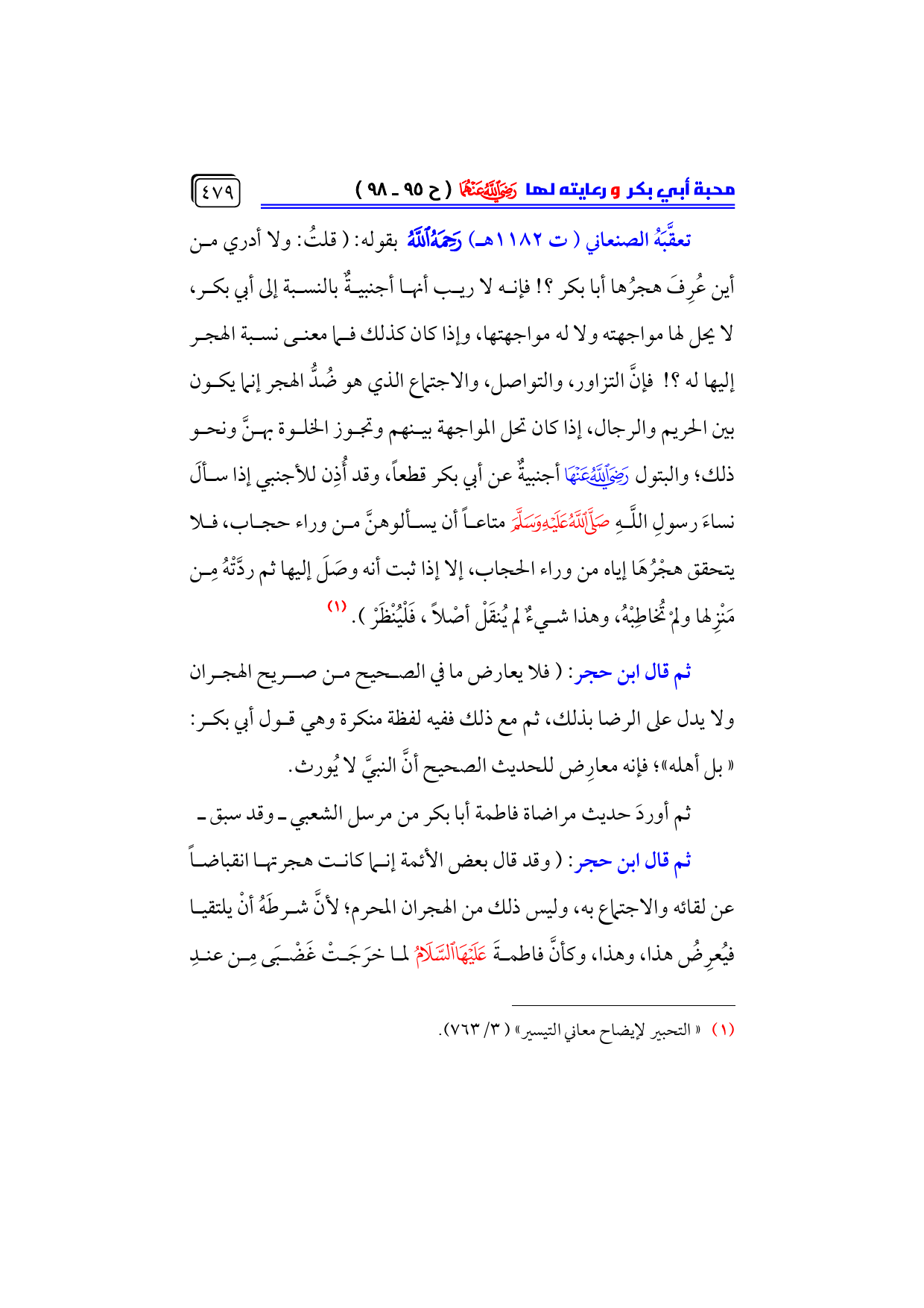 تعقَّبَهُ الصنعاني (ت ١١٨٢ هـ) - رحمه الله - بقوله: (قلتُ: ولا أدري من أين عُرِفَ هجرُها أبا بكر؟ ! فإنه لا ريب أنها أجنبيةٌ بالنسبة إلى أبي بكر، ... لا يحل لها مواجهته ولا له مواجهتها، وإذا كان كذلك فما معنى نسبة الهجر إليها له؟ ! فإنَّ التزاور، والتواصل، والاجتماع الذي هو ضُدُّ الهجر إنما يكون بين الحريم والرجال، إذا كان تحل المواجهة بينهم وتجوز الخلوة بهنَّ ونحو ذلك؛ والبتول - رضي الله عنها - أجنبيةٌ عن أبي بكر قطعاً، وقد أُذِن للأجنبي إذا سألَ نساءَ رسولِ اللَّهِ - صلى الله عليه وسلم - متاعاً أن يسألوهنَّ من وراء حجاب، فلا يتحقق هجْرُهَا إياه من وراء الحجاب، إلا إذا ثبت أنه وصَلَ إليها ثم ردَّتْهُ مِن مَنْزِلها ولمْ تُخاطِبْهُ، وهذا شيءٌ لم يُنقَلْ أصْلاً، فَلْيُنْظَرْ). (¬١)