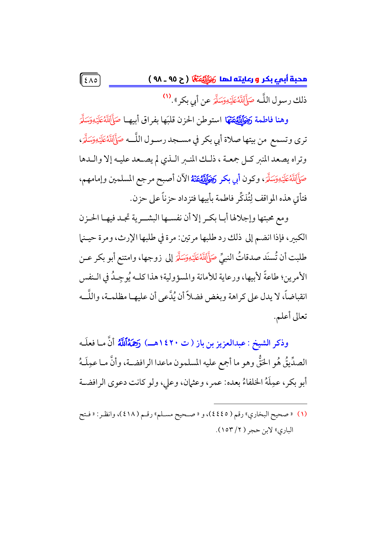 ومع محبتها وإجلالها أبا بكر إلا أن نفسها البشرية تجد فيها الحزن الكبير، فإذا انضم إلى ذلك رد طلبها مرتين: مرة في طلبها الإرث، ومرة حينما طلبت أن تُسنَد صدقاتُ النبيِّ - صلى الله عليه وسلم - إلى زوجها، وامتنع أبو بكر عن الأمرين؛ طاعةً لأبيها، ورعاية للأمانة والمسؤولية؛ هذا كله يُوجِدُ في النفس انقباضاً، لا يدل على كراهة وبغض فضلاً أن يُدَّعى أن عليها مظلمة، واللَّه تعالى أعلم.