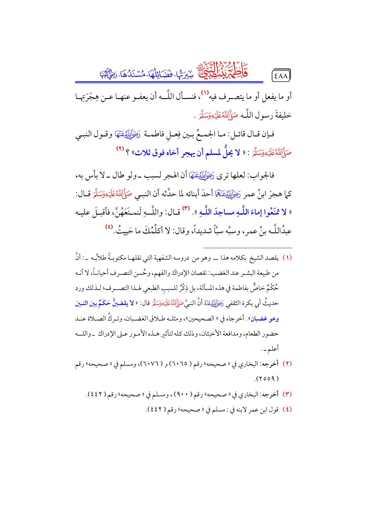 فإن قال قائل: ما الجمعُ بين فِعلِ فاطمة - رضي الله عنها - وقول النبي - صلى الله عليه وسلم -: «لا يحلُّ لمسلم أن يهجر أخاه فوق ثلاث»؟ (¬٢)