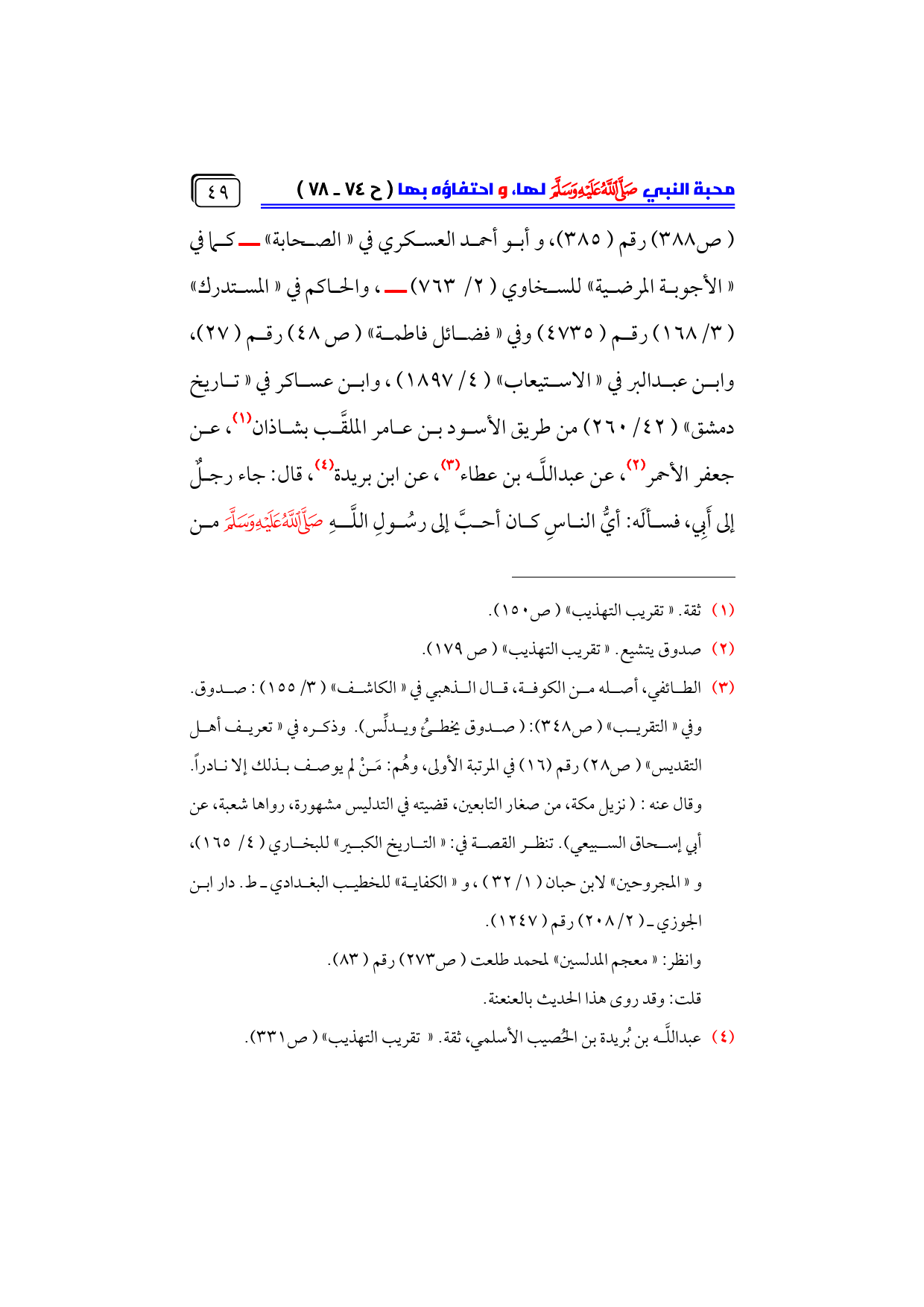 عن ابن بريدة (¬٤)، قال: جاء رجلٌ إلى أَبِي، فسألَه: أيُّ الناسِ كان أحبَّ إلى رسُولِ اللَّهِ - صلى الله عليه وسلم - من النساء؟ فقال: «كان أحبُّ الناسِ إلى رسولِ اللَّهِ - صلى الله عليه وسلم - من