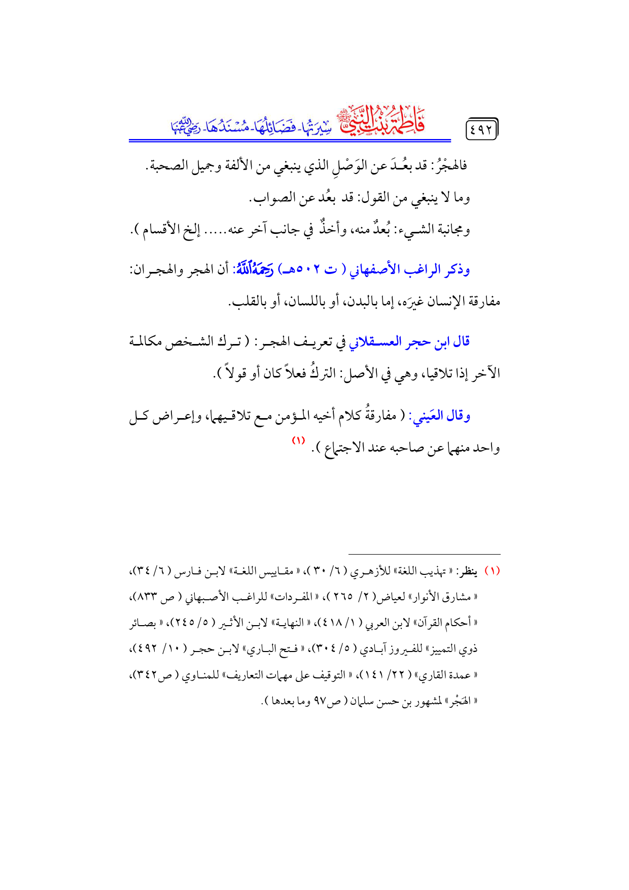 (¬١) ينظر: «تهذيب اللغة» للأزهري (٦/ ٣٠)، «مقاييس اللغة» لابن فارس (٦/ ٣٤)، ... «مشارق الأنوار» لعياض (٢/ ٢٦٥)، «المفردات» للراغب الأصبهاني (ص ٨٣٣)، ... «أحكام القرآن» لابن العربي (١/ ٤١٨)، «النهاية» لابن الأثير (٥/ ٢٤٥)، «بصائر ذوي التمييز» للفيروز آبادي (٥/ ٣٠٤)، «فتح الباري» لابن حجر (١٠/ ٤٩٢)، ... «عمدة القاري» (٢٢/ ١٤١)، «التوقيف على مهمات التعاريف» للمناوي (ص ٣٤٢)، «الهَجْر» لمشهور بن حسن سلمان (ص ٩٧ وما بعدها).