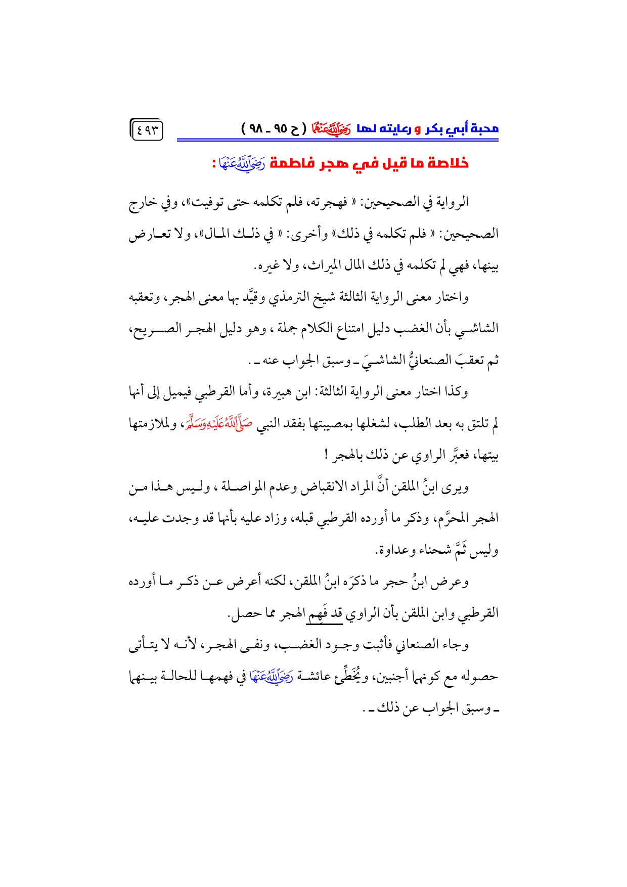 وكذا اختار معنى الرواية الثالثة: ابن هبيرة، وأما القرطبي فيميل إلى أنها لم تلتق به بعد الطلب، لشغلها بمصيبتها بفقد النبي - صلى الله عليه وسلم -، ولملازمتها بيتها، فعبَّر الراوي عن ذلك بالهجر!