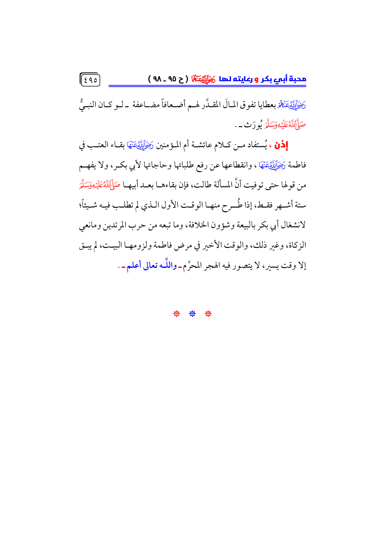 إذن، يُستفاد من كلام عائشة أم المؤمنين - رضي الله عنها - بقاء العتب في فاطمة - رضي الله عنها -، وانقطاعها عن رفع طلباتها وحاجاتها لأبي بكر، ولا يفهم من قولها حتى توفيت أنَّ المسألة طالت، فإن بقاءها بعد أبيها - صلى الله عليه وسلم - ستة أشهر فقط، إذا طُرح منها الوقت الأول الذي لم تطلب فيه شيئاً؛ لانشغال أبي بكر بالبيعة وشؤون الخلافة، وما تبعه من حرب المرتدين ومانعي الزكاة، وغير ذلك، والوقت الأخير في مرض فاطمة ولزومها البيت، لم يبق إلا وقت يسير، لا يتصور فيه الهجر المحرَّم ـ واللَّه تعالى أعلم ـ.
