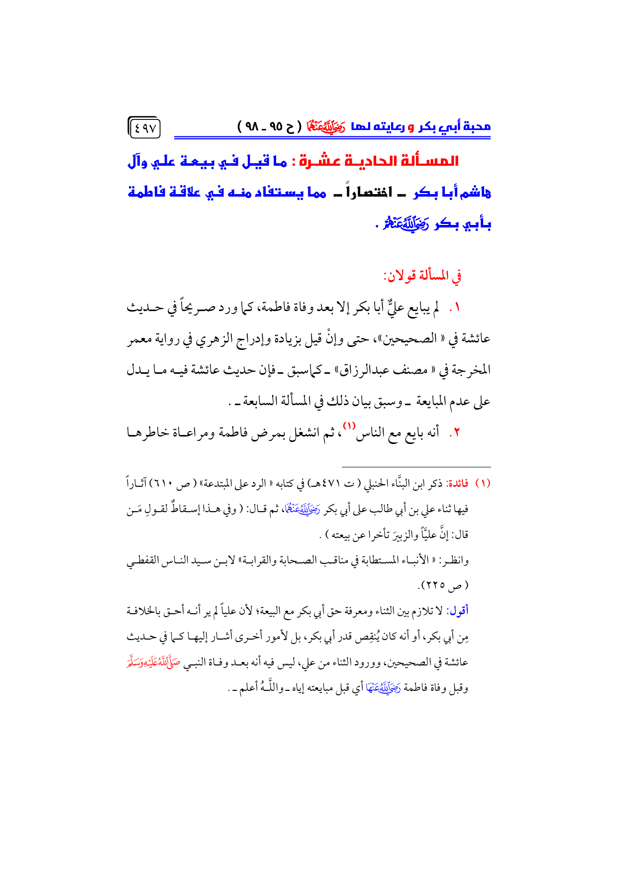 (¬١) فائدة: ذكر ابن البنَّاء الحنبلي (ت ٤٧١ هـ) في كتابه «الرد على المبتدعة» (ص ٦١٠) آثاراً فيها ثناء علي بن أبي طالب على أبي بكر - رضي الله عنهما -، ثم قال: (وفي هذا إسقاطٌ لقولِ مَن قال: إنَّ عليَّاً والزبيرَ تأخرا عن بيعته).