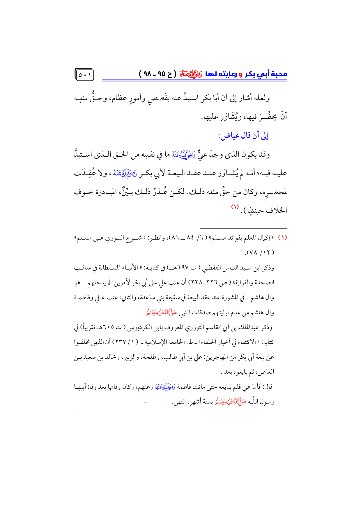 وقد يكون الذى وجدَ عليٌّ - رضي الله عنه - ما في نفسِه من الحق الذى استبدَّ عليه فيه؛ أنه لم يُشاوَر عند عقد البيعة لأبي بكر - رضي الله عنه -، ولا عُقِدَت لمحضرِه، وكان من حقِّ مثله ذلك. لكن عُذرُ ذلك بيِّنٌ، المبادرة خوف الخلاف حينئذٍ). (¬١)