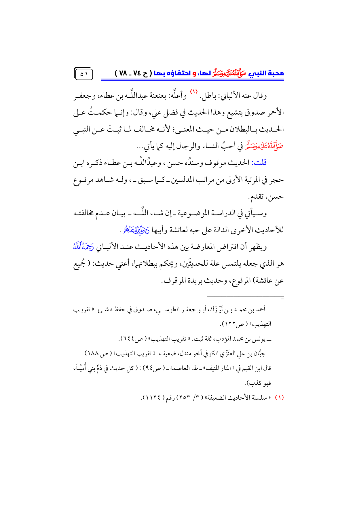 وقال عنه الألباني: باطل. (¬١) وأعلَّه: بعنعنة عبداللَّه بن عطاء، وجعفر الأحمر صدوق يتشيع وهذا الحديث في فضل علي، وقال: وإنما حكمتُ على الحديث بالبطلان من حيث المعنى؛ لأنه مخالف لما ثبتَ عن النبي - صلى الله عليه وسلم - في أحبِّ النساء والرجال إليه كما يأتي ...