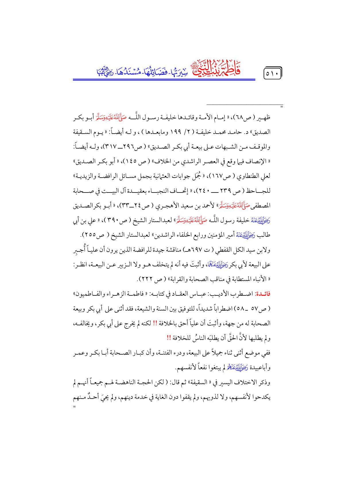 = ظهير (ص ٦٨)، «إمام الأمة وقائدها خليفة رسول اللَّه - صلى الله عليه وسلم - أبو بكر الصديق» د. حامد محمد خليفة (٢/ ١٩٩ ومابعدها)، وله أيضاً: «يوم السقيفة والموقف من الشبهات على بيعة أبي بكر الصديق» (ص ٢٩٦ ـ ٣١٧)، وله أيضاً: ... «الإنصاف فيما وقع في العصر الراشدي من الخلاف» (ص ١٤٥)، «أبو بكر الصديق» لعلي الطنطاوي (ص ١٦٧)، «جُمَل جوابات العثمانية بجمل مسائل الرافضة والزيدية» للجاحظ (ص ٢٣٩ ـ ٢٤٠)، «إتحاف النجباء بعقيدة آل البيت في صحابة المصطفى - صلى الله عليه وسلم -» لأحمد بن سعيد الأهجري (ص ٢٤ ـ ٣٣)، «أبو بكرالصديق - رضي الله عنه - خليفة رسول اللَّه - صلى الله عليه وسلم -» لعبدالستار الشيخ (ص ٣٩٠)، «علي بن أبي طالب - رضي الله عنه - أمير المؤمنين ورابع الخلفاء الراشدين» لعبدالستار الشيخ (ص ٢٥٥).