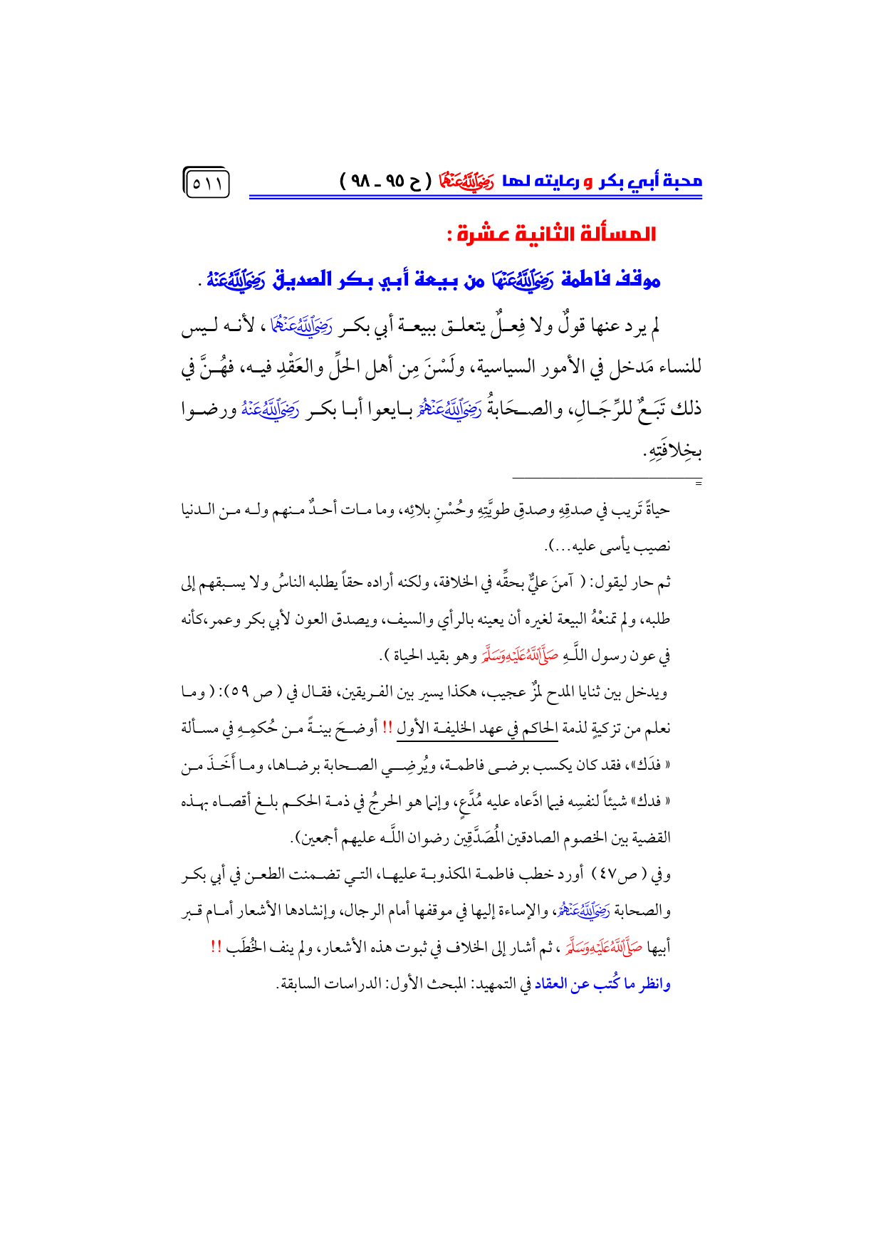 وفي (ص ٤٧) أورد خطب فاطمة المكذوبة عليها، التي تضمنت الطعن في أبي بكر والصحابة - رضي الله عنهم -، والإساءة إليها في موقفها أمام الرجال، وإنشادها الأشعار أمام قبر أبيها - صلى الله عليه وسلم -، ثم أشار إلى الخلاف في ثبوت هذه الأشعار، ولم ينف الخُطَب! !