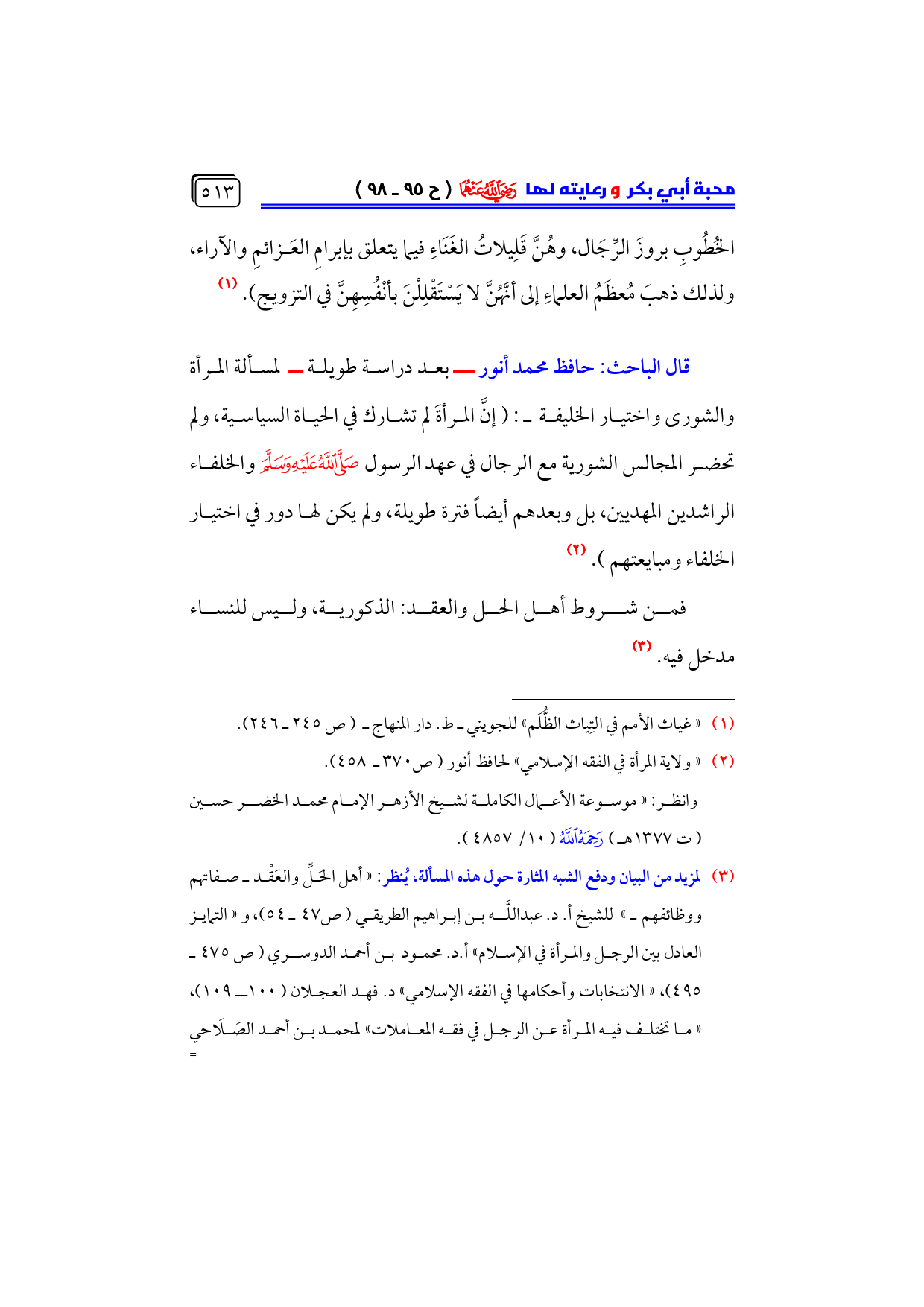 قال الباحث: حافظ محمد أنور ــ بعد دراسة طويلة ـ لمسألة المرأة والشورى واختيار الخليفة ـ: (إنَّ المرأةَ لم تشارك في الحياة السياسية، ولم تحضر المجالس الشورية مع الرجال في عهد الرسول - صلى الله عليه وسلم - والخلفاء الراشدين المهديين، بل وبعدهم أيضاً فترة طويلة، ولم يكن لها دور في اختيار الخلفاء ومبايعتهم). (¬٢)