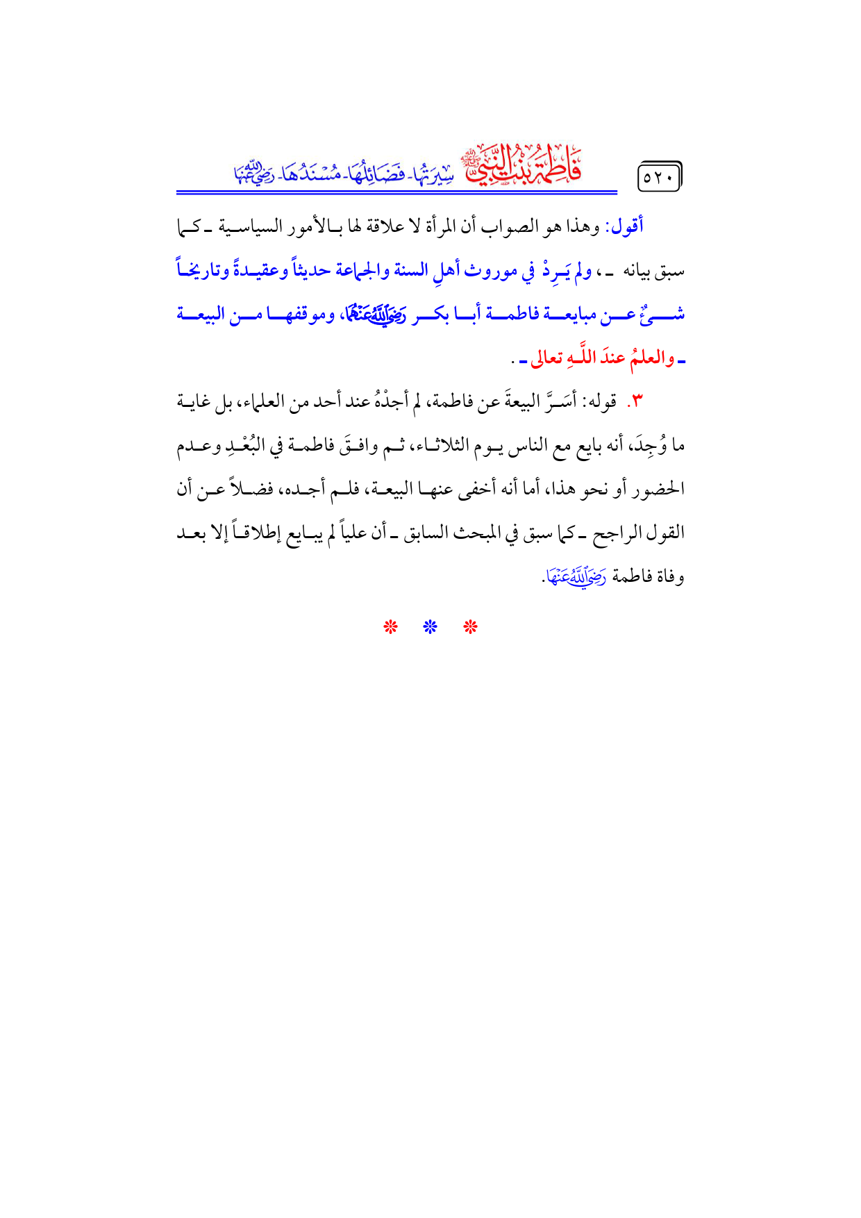 ٣. قوله: أسَرَّ البيعةَ عن فاطمة، لم أجدْهُ عند أحد من العلماء، بل غاية ما وُجِدَ، أنه بايع مع الناس يوم الثلاثاء، ثم وافقَ فاطمة في البُعْدِ وعدم الحضور أو نحو هذا، أما أنه أخفى عنها البيعة، فلم أجده، فضلاً عن أن القول الراجح ـ كما سبق في المبحث السابق ـ أن علياً لم يبايع إطلاقاً إلا بعد وفاة فاطمة - رضي الله عنها -.