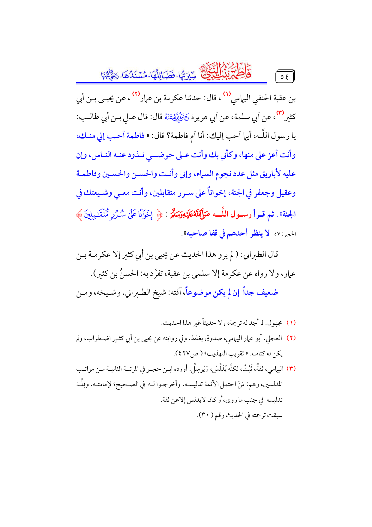 بن عقبة الحنفي اليمامي (¬١)، قال: حدثنا عكرمة بن عمار (¬٢)، عن يحيى بن أبي كثير (¬٣)، عن أبي سلمة، عن أبي هريرة - رضي الله عنه - قال: قال علي بن أبي طالب: يا رسول اللَّه، أيما أحب إليك: أنا أم فاطمة؟ قال: «فاطمة أحب إلي منك، وأنت أعز علي منها، وكأني بك وأنت على حوضي تذود عنه الناس، وإن عليه لأباريق مثل عدد نجوم السماء، وإني وأنت والحسن والحسين وفاطمة وعقيل وجعفر في الجنة، إخواناً على سرر متقابلين، وأنت معي وشيعتك في الجنة». ثم قرأ رسول اللَّه - صلى الله عليه وسلم -: { ... إِخْوَانًا عَلَى سُرُرٍ مُتَقَابِلِينَ} الحجر: ٤٧ لا ينظر أحدهم في قفا صاحبه».