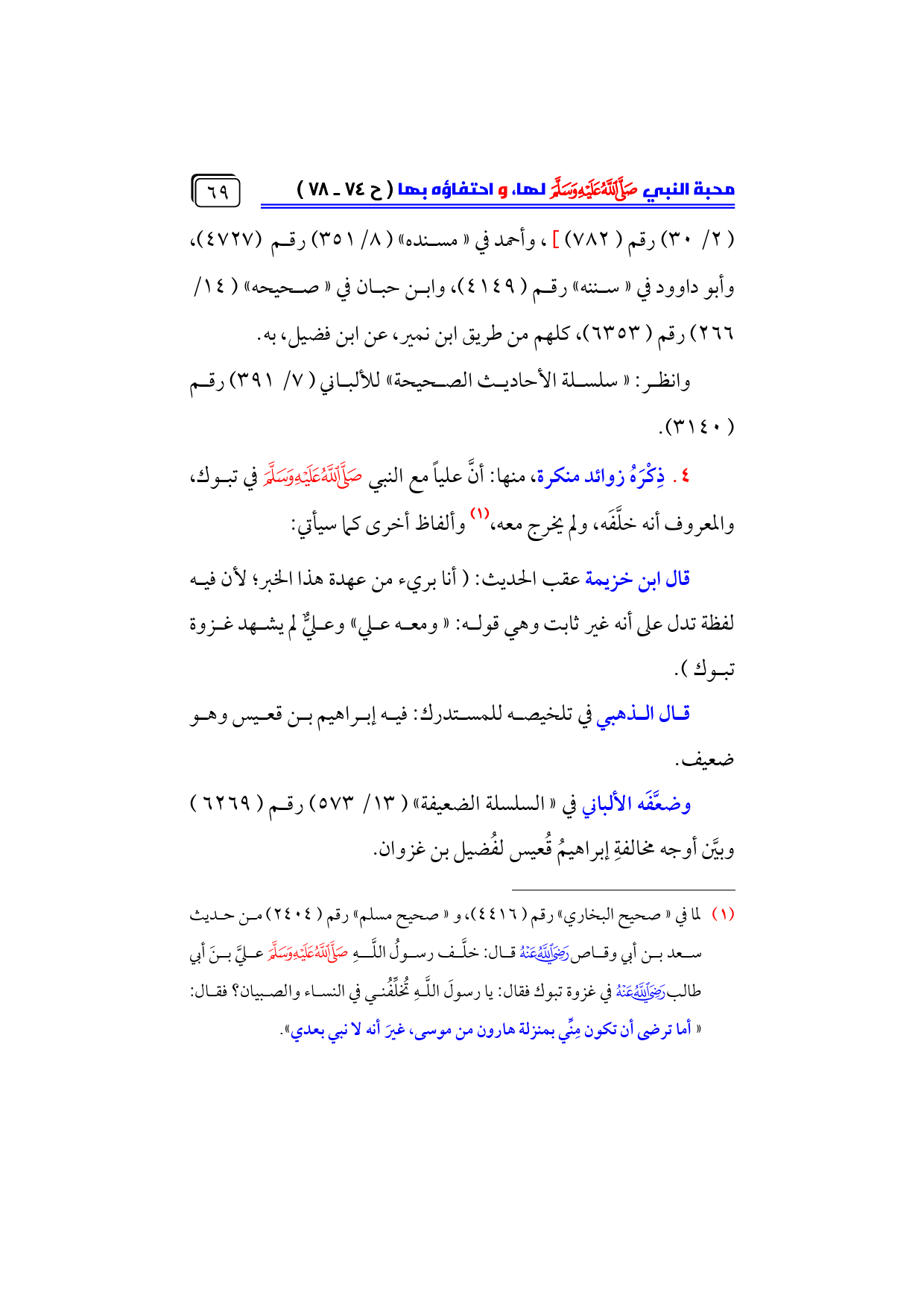 (¬١) لما في «صحيح البخاري» رقم (٤٤١٦)، و «صحيح مسلم» رقم (٢٤٠٤) من حديث سعد بن أبي وقاص - رضي الله عنه - قال: خلَّف رسولُ اللَّهِ - صلى الله عليه وسلم - عليَّ بنَ أبي طالب - رضي الله عنه - في غزوة تبوك فقال: يا رسولَ اللَّهِ تُخلِّفُني في النساء والصبيان؟ فقال: ... «أما ترضى أن تكون مِنِّي بمنزلة هارون من موسى، غيرَ أنه لا نبي بعدي».
