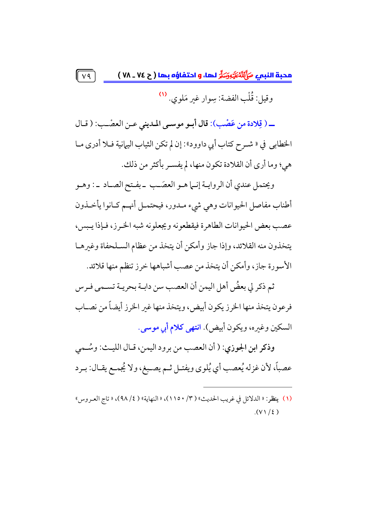 ــ (قِلادة من عَصْب): قال أبو موسى المديني عن العصْب: (قال الخطابى في «شرح كتاب أبي داوود»: إن لم تكن الثياب اليمانية فلا أدرى ما هي؛ وما أرى أن القلادة تكون منها، لم يفسر بأكثر من ذلك.