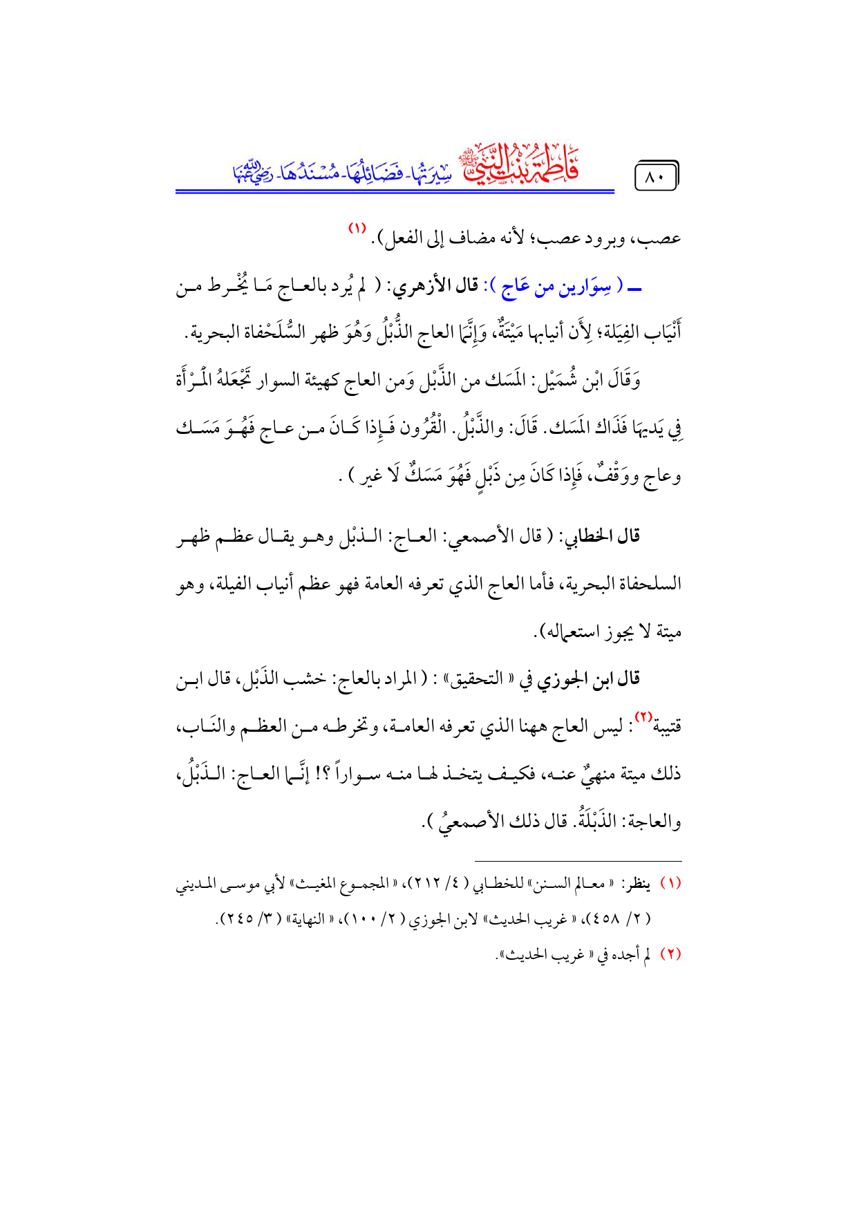 ــ (سِوَارين من عَاج): قال الأزهري: (لم يُرد بالعاج مَا يُخْرط من أَنْيَاب الفِيَلة؛ لِأَن أنيابها مَيْتَةٌ، وَإِنَّمَا العاج الذُّبْلُ وَهُوَ ظهر السُّلَحْفاة البحرية.