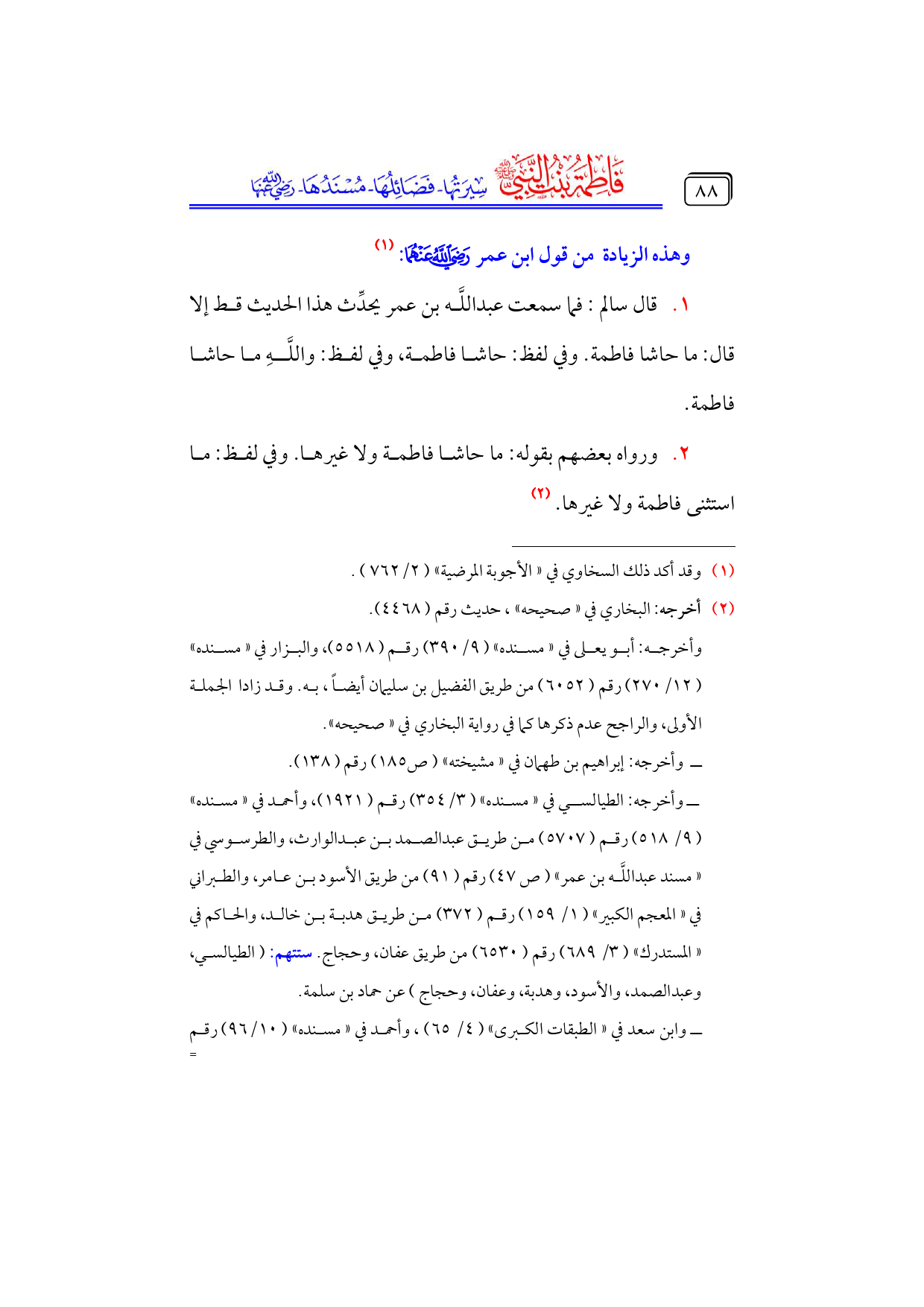 ١. قال سالم: فما سمعت عبداللَّه بن عمر يحدِّث هذا الحديث قط إلا قال: ما حاشا فاطمة. وفي لفظ: حاشا فاطمة، وفي لفظ: واللَّهِ ما حاشا فاطمة.