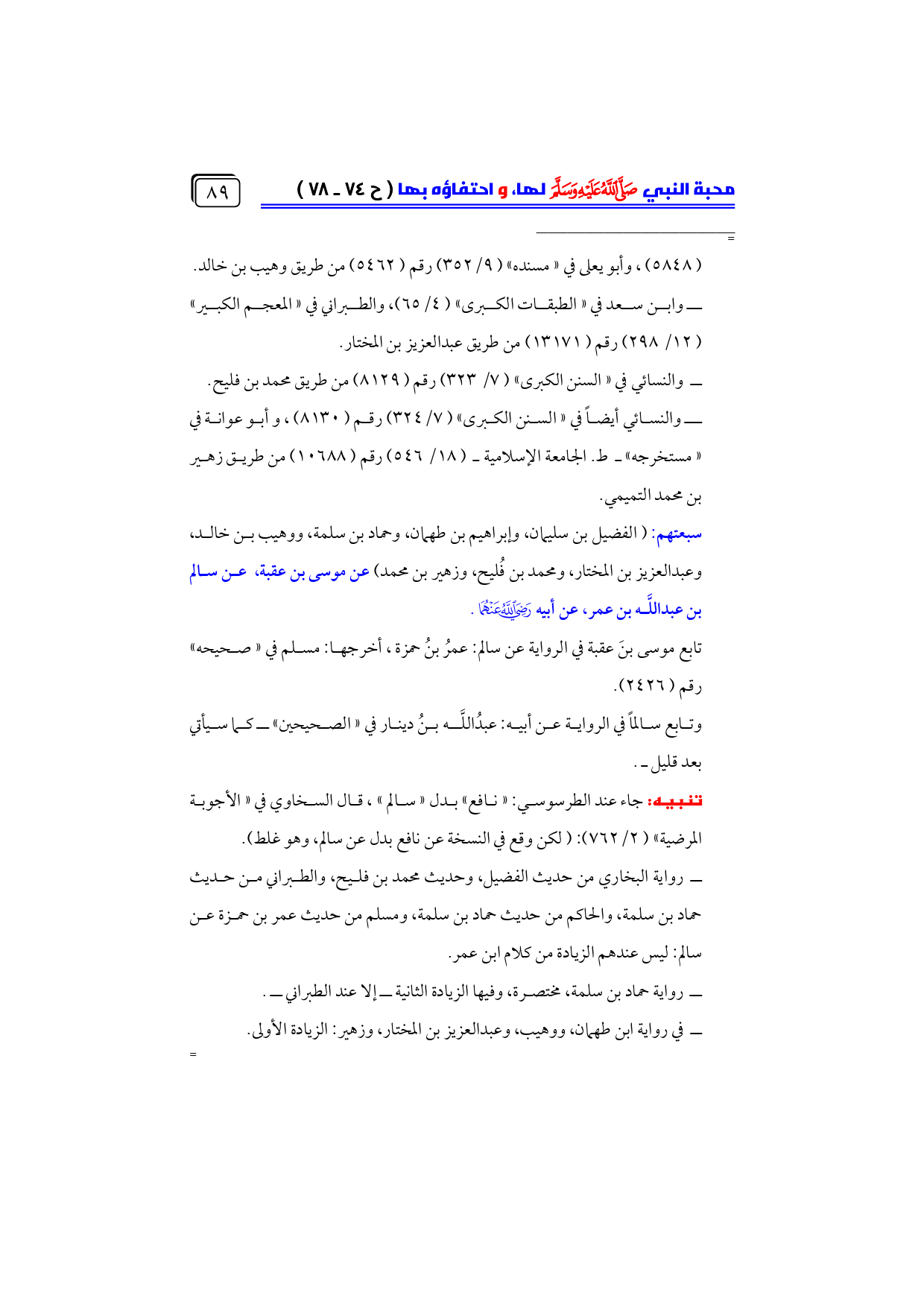 سبعتهم: (الفضيل بن سليمان، وإبراهيم بن طهمان، وحماد بن سلمة، ووهيب بن خالد، وعبدالعزيز بن المختار، ومحمد بن فُليح، وزهير بن محمد) عن موسى بن عقبة، عن سالم بن عبداللَّه بن عمر، عن أبيه - رضي الله عنهما -.