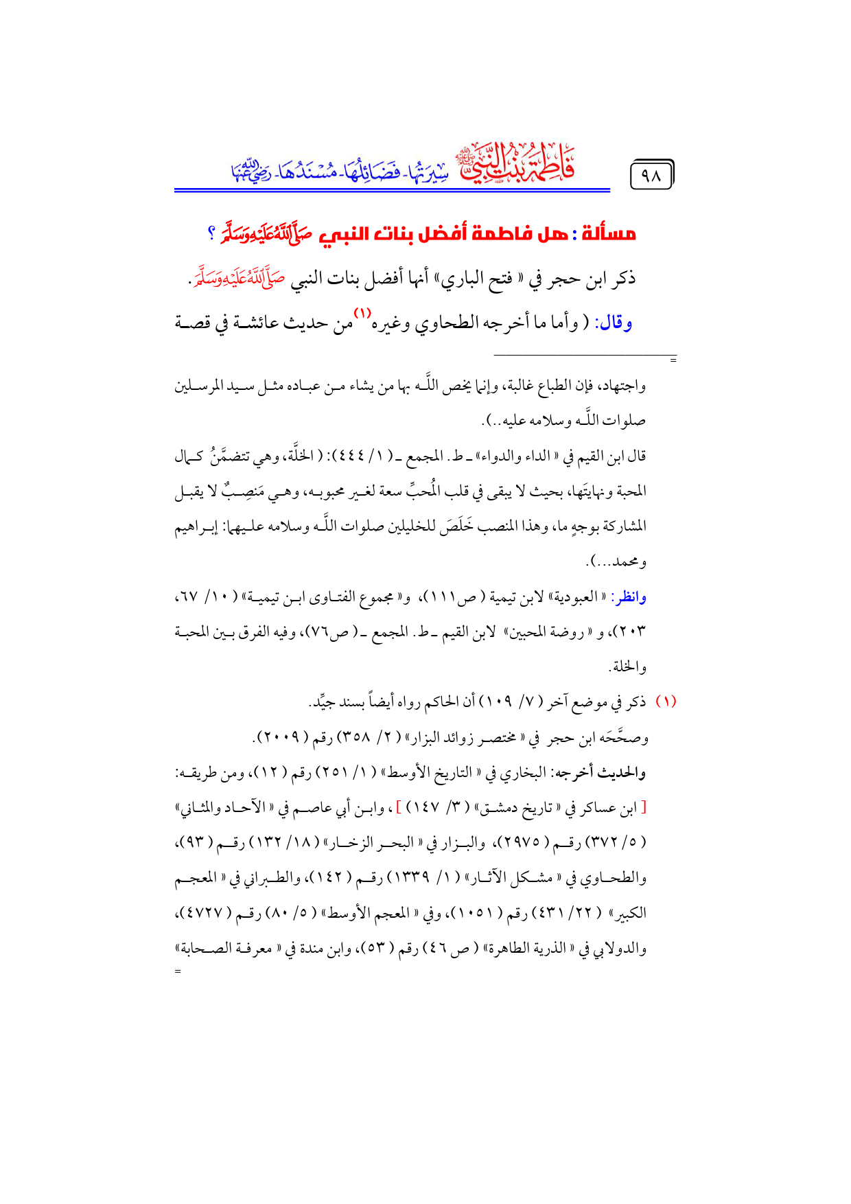 مسألة: هل فاطمة أفضل بنات النبي - صلى الله عليه وسلم -؟