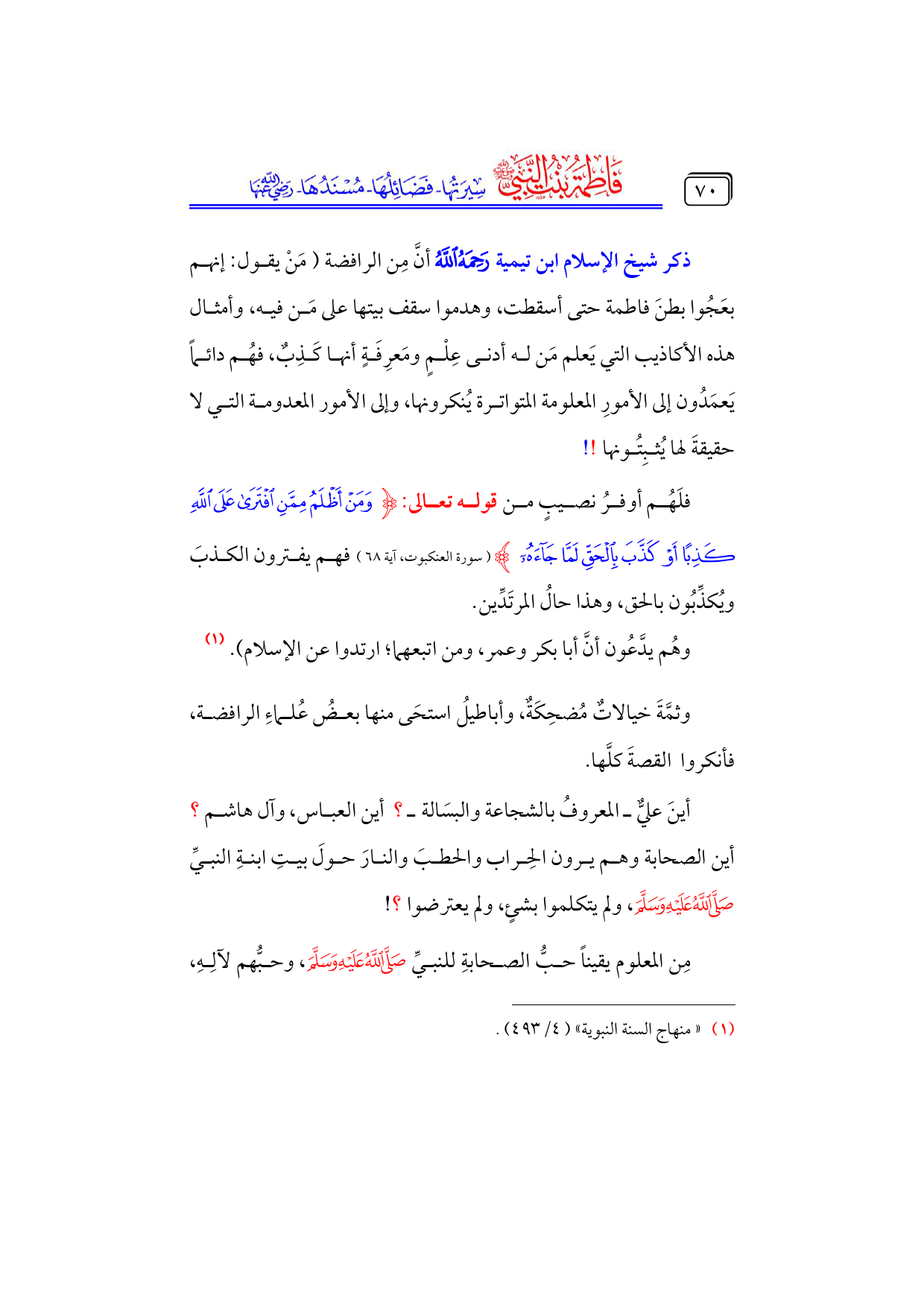 ذكر شيخ الإسلام ابن تيمية - رحمه الله - أنَّ مِن الرافضة (مَنْ يقول: إنهم بعَجُوا بطنَ فاطمة حتى أسقطت، وهدموا سقف بيتها على مَن فيه، وأمثال هذه الأكاذيب التي يَعلم مَن له أدنى عِلْمٍ ومَعرِفَةٍ أنها كَذِبٌ، فهُم دائماً يَعمَدُون إلى الأمورِ المعلومة المتواترة يُنكرونها، وإلى الأمور المعدومة التي لا حقيقةَ لها يُثبِتُونها! !
