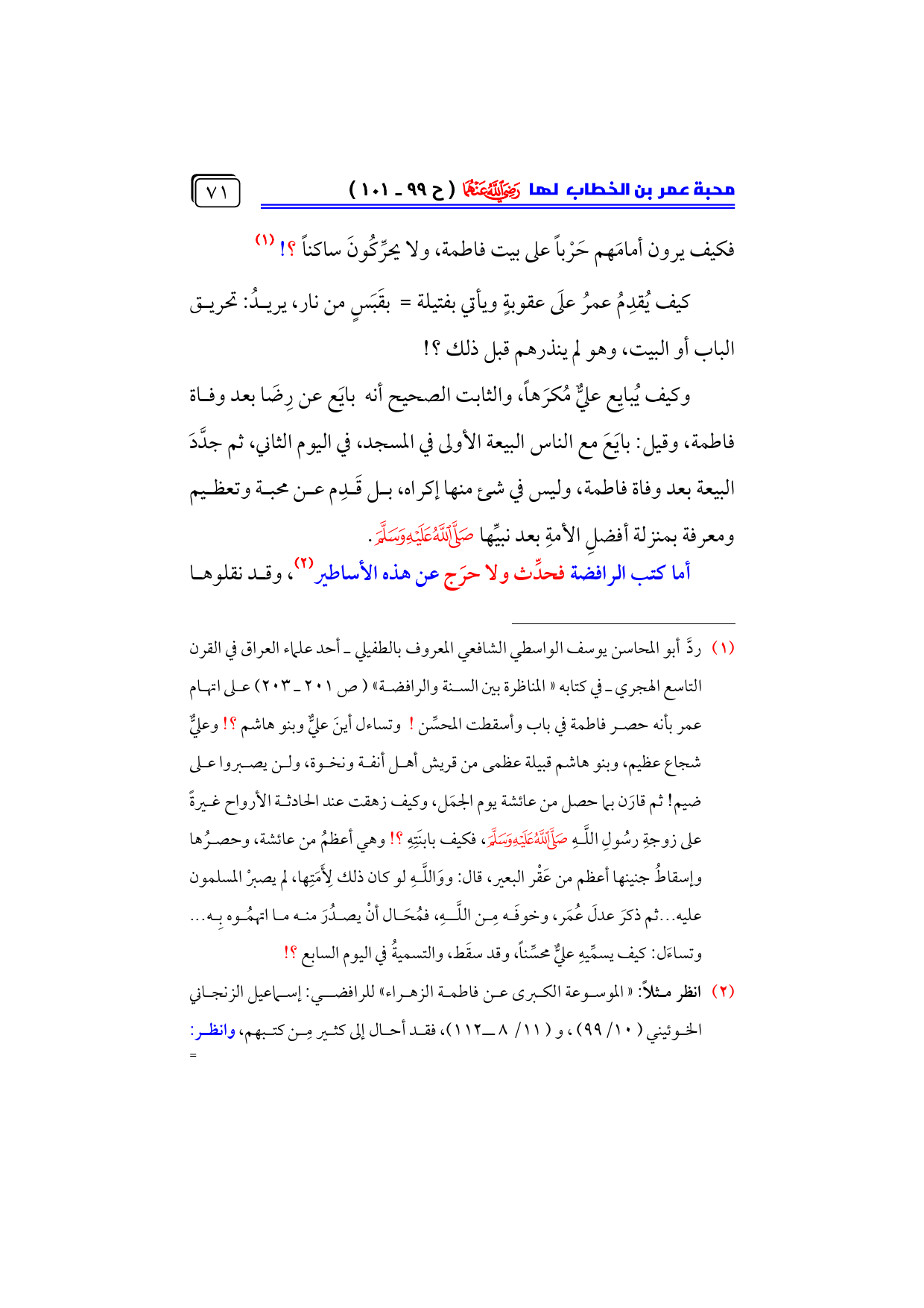 (¬١) ردَّ أبو المحاسن يوسف الواسطي الشافعي المعروف بالطفيلي ـ أحد علماء العراق في القرن التاسع الهجري ـ في كتابه «المناظرة بين السنة والرافضة» (ص ٢٠١ ـ ٢٠٣) على اتهام عمر بأنه حصر فاطمة في باب وأسقطت المحسِّن! وتساءل أينَ عليٌّ وبنو هاشم؟ ! وعليٌّ شجاع عظيم، وبنو هاشم قبيلة عظمى من قريش أهل أنفة ونخوة، ولن يصبروا على ضيم! ثم قارَن بما حصل من عائشة يوم الجمَل، وكيف زهقت عند الحادثة الأرواح غيرةً على زوجةِ رسُولِ اللَّهِ - صلى الله عليه وسلم -، فكيف بابنَتِهِ؟ ! وهي أعظمُ من عائشة، وحصرُها وإسقاطُ جنينها أعظم من عَقْر البعير، قال: ووَاللَّهِ لو كان ذلك لِأَمَتِها، لم يصبرْ المسلمون عليه ... ثم ذكرَ عدلَ عُمَر، وخوفَه مِن اللَّهِ، فمُحَال أنْ يصدُرَ منه ما اتهمُوه بِه ... وتساءَل: كيف يسمِّيهِ عليٌّ محسِّناً، وقد سقَط، والتسميةُ في اليوم السابع؟ !