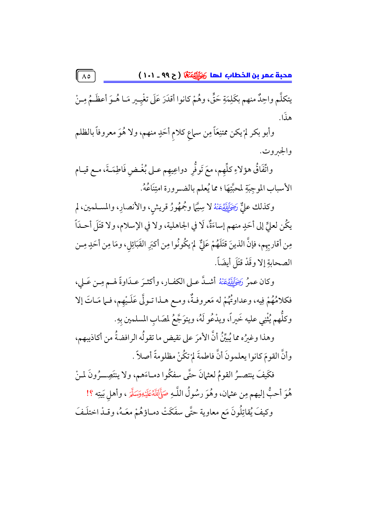 وكذلك عليٌّ - رضي الله عنه - لا سِيَّمَا وجُمهُورُ قريشٍ، والأنصارِ، والمسلمين، لم يكُن لعليٍّ إلى أحَدٍ منهم إساءَةٌ، لَا في الجاهلية، ولا في الإسلام، ولا قتَلَ أحدَاً مِن أقاربِهِم، فإنَّ الذينَ قتَلَهُمْ عَليٌّ لمْ يكُونُوا مِن أكبَرِ القَبَائِلِ، ومَا مِن أحَدٍ مِن الصحابةِ إلا وقَدْ قتَلَ أيضَاً.