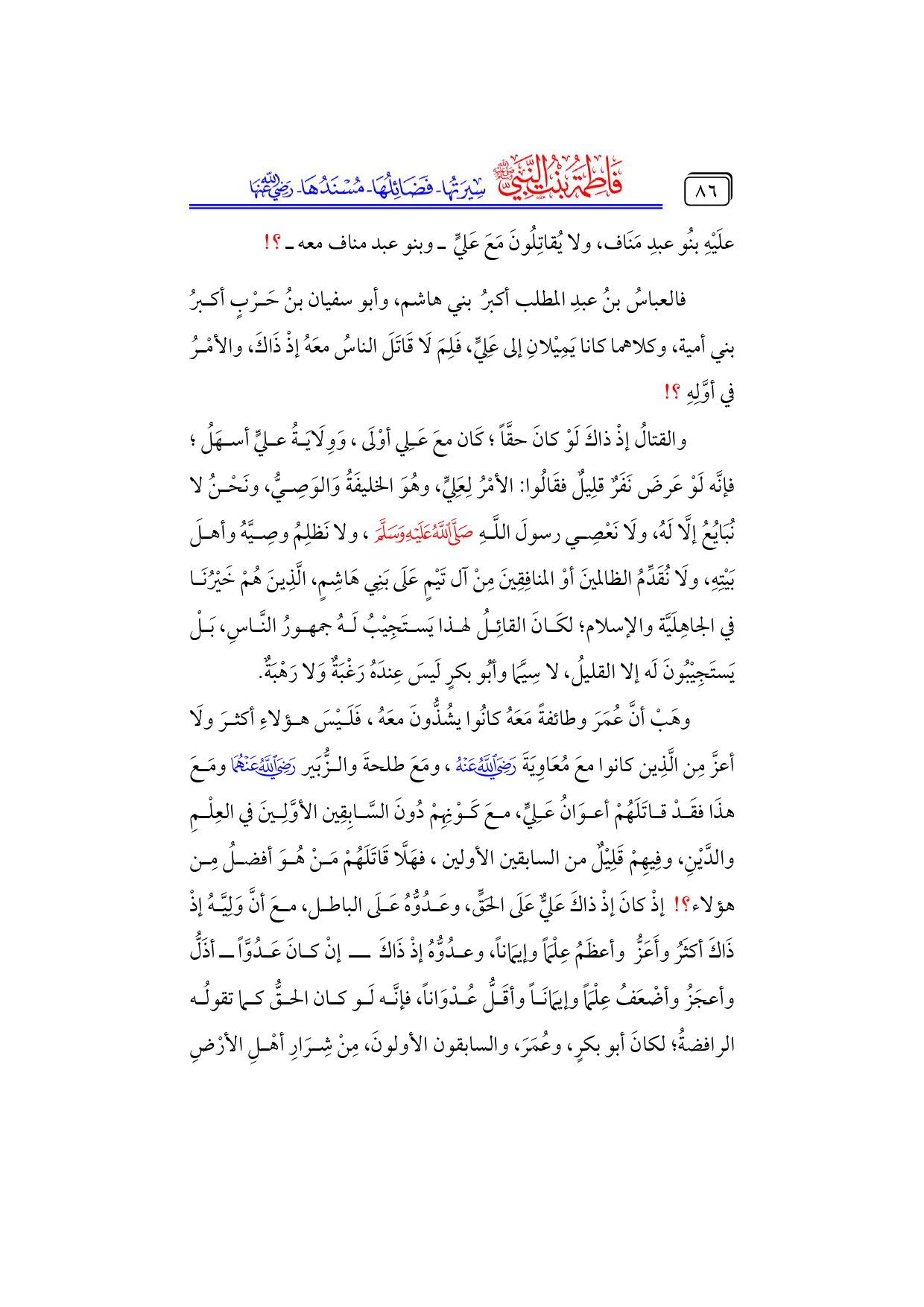 فالعباسُ بنُ عبدِ المطلب أكبرُ بني هاشم، وأبو سفيان بنُ حَرْبٍ أكبرُ بني أمية، وكلاهما كانا يَمِيْلانِ إلى عَلِيٍّ، فَلِمَ لَا قَاتَلَ الناسُ معَهُ إذْ ذَاكَ، والأمْرُ في أوَّلِهِ؟ !