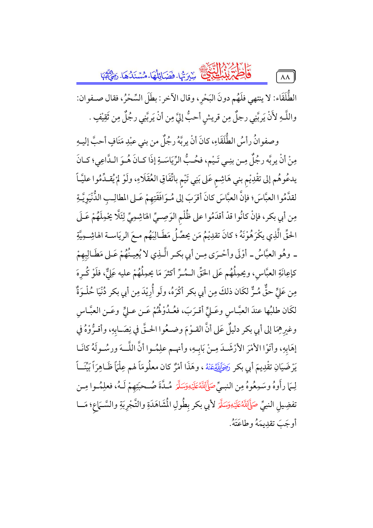 وصفوانُ رأسُ الطُّلَقَاءِ، كانَ أنْ يربَّهُ رجُلٌ من بني عبْدِ مَنَافٍ أحبَّ إليهِ مِنْ أنْ يربَّه رجُلٌ مِن بنِي تَيْم، فحُبُّ الرِّيَاسَةِ إذَا كانَ هُوَ الدَّاعِي؛ كانَ يدعُوهُم إلى تقْدِيْمِ بني هَاشِمٍ عَلى بَنِي تَيْمٍ باتِّفَاقِ العُقَلَاءِ، ولَوْ لمْ يُقدِّمُوا عليَّاً لقدَّمُوا العبَّاسَ؛ فإنَّ العبَّاسَ كانَ أقرَبَ إلى مُوَافَقَتِهِمْ عَلى المطالِبِ الدُّنْيَوِيَّةِ مِن أبي بكر، فإنْ كانُوا قدْ أقدَمُوا على ظُلْمِ الوَصِيِّ الهَاشِمِيِّ لِئَلَّا يحْمِلَهُمْ عَلَى الحقِّ الَّذِي يكْرَهُوْنَهُ؛ كانَ تقدِيْمُ مَن يحصِّلُ مَطَالِبَهُم معَ الريَاسة الهاشِمِيَّةِ ... ـ وهُو العبَّاسُ ـ أوْلَى وأحْرَى مِن أبي بكر الَّذِي لا يُعِينُهُمْ عَلى مَطَالِبِهِمْ كإعِانَةِ العبَّاسِ، ويحمِلُهُم عَلى الحَقِّ المُرِّ أكثرَ مَا يحمِلُهُمْ عليه عَلِيٌّ، فلَوْ كُرِهَ مِن عَليٍّ حقٌّ مُرٌّ لكَان ذلكَ مِن أبي بكر أكْرَهُ، ولَو أُرِيْدَ مِن أبي بكر دُنْيَا حُلْوَةٌ لكَان طلبُها عندَ العبَّاسِ وعَليٍّ أقرَبَ، فعُدُوْلُهُمْ عَن عليٍّ وعَن العبَّاسِ وغيرِهِمَا إلى أبي بكر دليلٌ عَلى أنَّ القوْمَ وضعُوا الحقَّ في نِصَابِهِ، وأقرُّوْهُ في إهَابِهِ، وأتَوْا الأمْرَ الأرْشَدَ مِنْ بَابِهِ، وأنهم علِمُوا أنَّ اللَّهَ ورسُولَهُ كانَا يَرْضَيَانِ تقْدِيمَ أبي بكر - رضي الله عنه -، وهَذَا أمْرٌ كان معلُومَاً لهم عِلْمَاً ظَاهِرَاً بَيِّنَاً لِمَا رأَوهُ وسَمِعُوهُ مِن النبيِّ - صلى الله عليه وسلم - مُدَّةَ صُحبَتِهِمْ لَهُ، فعلِمُوا مِن تفضِيلِ النبيِّ - صلى الله عليه وسلم - لأبي بكر بِطُولِ المُشَاهَدَةِ والتَّجْرِبَةِ والسَّمَاعِ؛ مَا أوجَبَ تقدِيمَهُ وطاعَتَهُ.