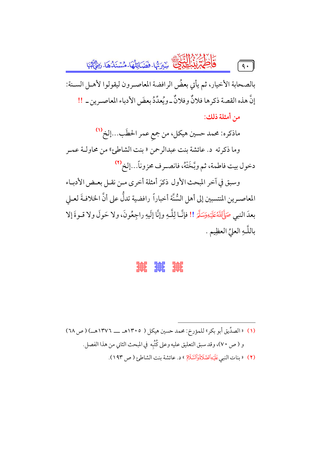 (¬٢) «بنات النبي - عليه الصلاة والسلام -» د. عائشة بنت الشاطئ (ص ١٩٣).