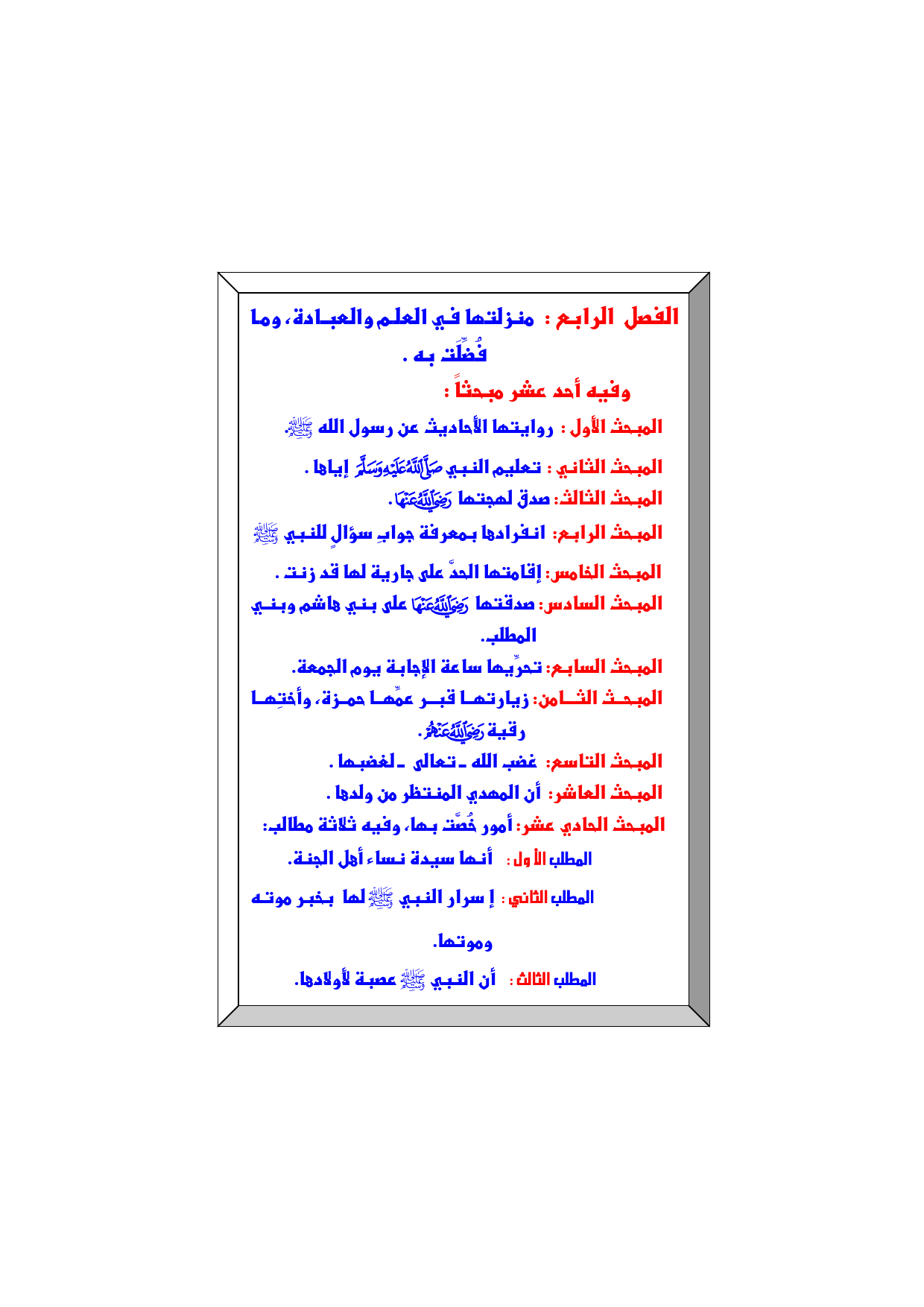 الفصل الرابع: منزلتها في العلم والعبادة، وما فُضِّلَت به. وفيه أحد عشر مبحثاً: