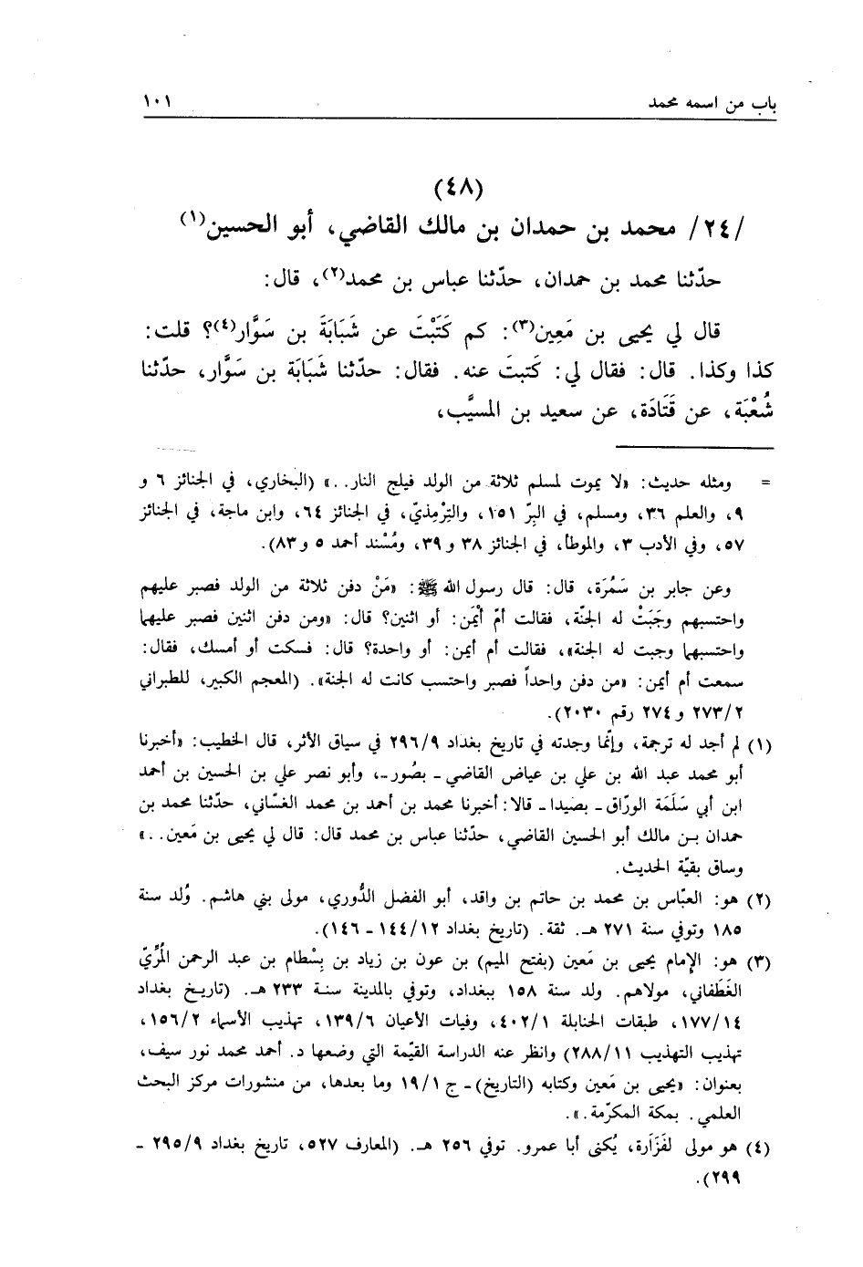 حَدَّثَنَا مُحَمَّدُ بْنُ حَمْدَانَ، حَدَّثَنَا عَبَّاسُ بْنُ مُحَمَّدٍ، قَالَ: قَالَ لِي يَحْيَى بْنُ مَعِينٍ: كَمْ كَتَبْتَ عَنْ شَبَابَةَ بْنِ سَوَّارٍ، قُلْتُ: كَذَا وَكَذَا، قَالَ: فَقَالَ لِي كَتَبْتَ عَنْهُ، فَقَالَ: حَدَّثَنَا شَبَابَةُ بْنُ سَوَّارٍ، حَدَّثَنَا شُعْبَةُ عَنْ قَتَادَةَ عَنْ سَعِيدِ بْنِ الْمُسَيِّبِ -[102]- عَنْ أَبِيهِ قَالَ: «§كُنَّا يَوْمِ الْحُدَيْبِيَةِ أَلْفًا وَأَرْبَعَمِائَةٍ» قَالَ: قُلْتُ: لَا وَاللَّهِ مَا سَمِعْتُ هَذَا قَطُّ