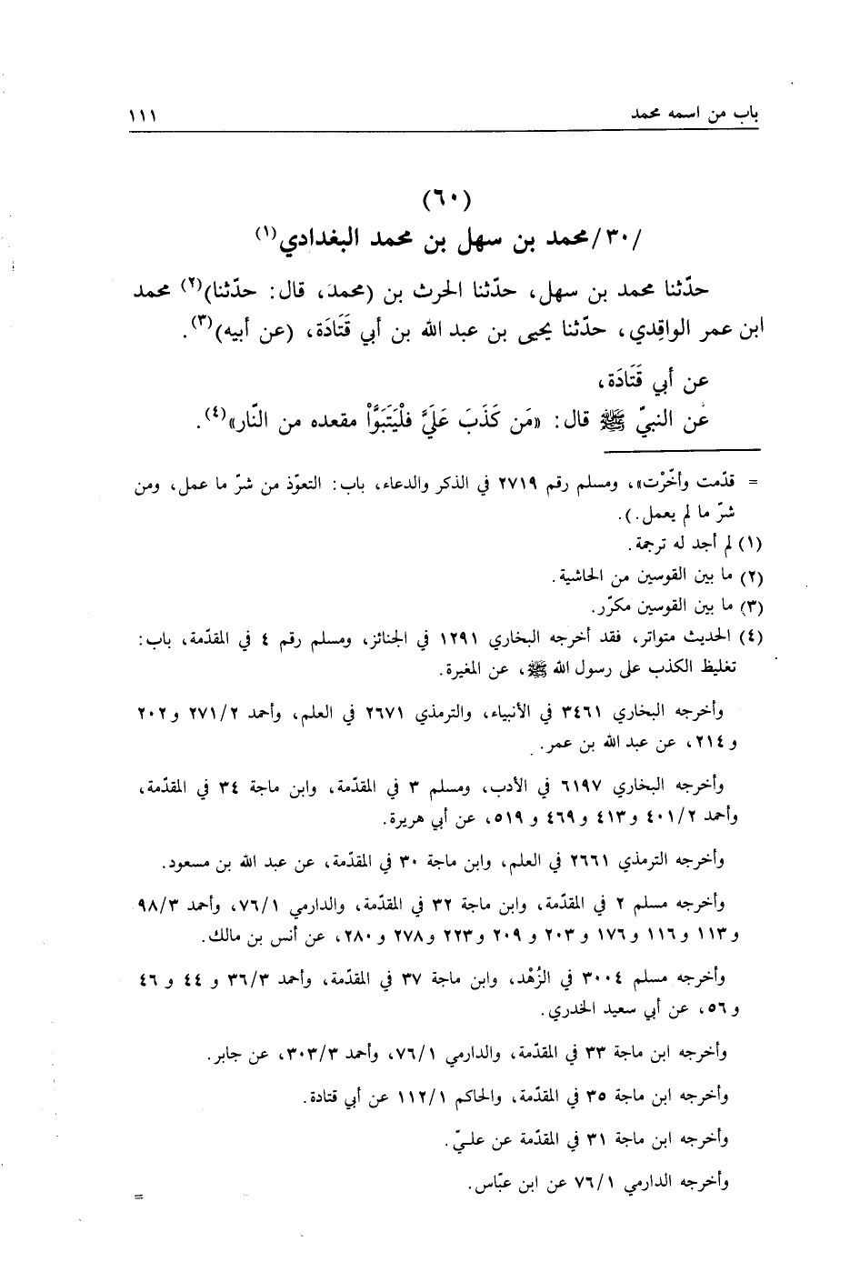 حَدَّثَنَا مُحَمَّدُ بْنُ سَهْلٍ، حَدَّثَنَا الْحَرْثُ بْنُ مُحَمَّدٍ، قَالَ: حَدَّثَنَا مُحَمَّدُ بْنُ عُمَرَ الْوَاقِدِيُّ، حَدَّثَنَا يَحْيَى بْنُ عَبْدِ اللَّهِ بْنِ أَبِي قَتَادَةَ، عَنْ أَبِيهِ، عَنْ أَبِي قَتَادَةَ، عَنِ النَّبِيِّ صَلَّى اللهُ عَلَيْهِ وَسَلَّمَ قَالَ: §«مَنْ كَذَبَ عَلَيَّ؛ فَلْيَتَبَوَّأْ مَقْعَدَهُ مِنَ النَّارِ»