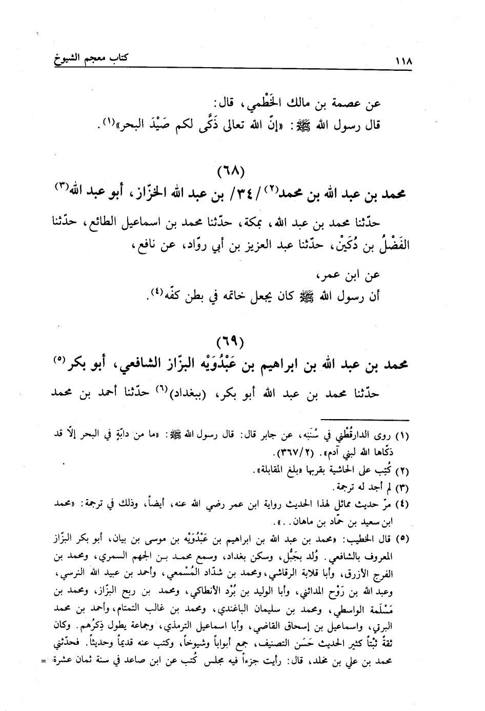حَدَّثَنَا مُحَمَّدُ بْنُ عَبْدِ اللَّهِ بِمَكَّةَ، حَدَّثَنَا مُحَمَّدُ بْنُ إِسْمَاعِيلَ الطَّائِعُ، حَدَّثَنَا الْفَضْلُ بْنُ دُكَيْنٍ، حَدَّثَنَا عَبْدُ الْعَزِيزِ بْنُ أَبِي رَوَّادٍ، عَنْ نَافِعٍ، عَنِ ابْنِ عُمَرَ، أَنَّ رَسُولَ اللَّهِ صَلَّى اللهُ عَلَيْهِ وَسَلَّمَ «كَانَ §يَجْعَلُ خَاتَمَهُ فِي بَطْنِ كَفِّهِ»