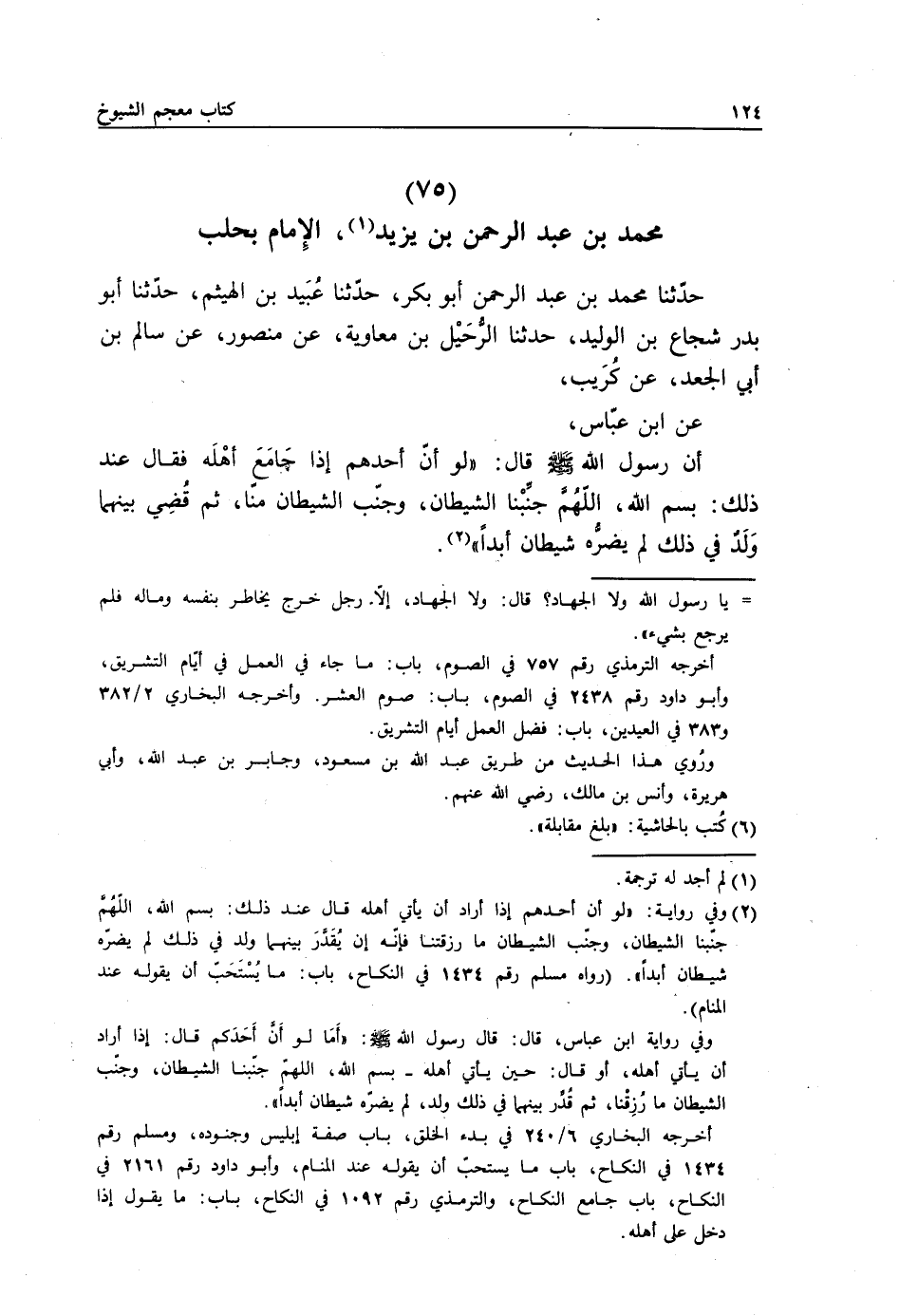 حَدَّثَنَا مُحَمَّدُ بْنُ عَبْدِ الرَّحْمَنِ أَبُو بَكْرٍ، حَدَّثَنَا عُبَيْدُ بْنُ الْهَيْثَمِ، حَدَّثَنَا أَبُو بَدْرٍ شُجَاعُ بْنُ الْوَلِيدِ حَدَّثَنَا الرَّحِيلُ بْنُ مُعَاوِيَةَ، عَنْ مَنْصُورٍ، عَنْ سَالِمِ بْنِ أَبِي الْجَعْدِ، عَنْ كُرَيْبٍ، عَنِ ابْنِ عَبَّاسٍ، أَنَّ رَسُولَ اللَّهِ صَلَّى اللهُ عَلَيْهِ وَسَلَّمَ قَالَ: §" لَوْ أَنَّ أَحَدَهُمْ إِذَا جَامِعَ أَهْلَهُ فَقَالَ عِنْدَ ذَلِكَ: بِسْمِ اللَّهِ اللَّهُمَّ جَنِّبْنَا الشَّيْطَانَ وَجَنِّبِ الشَّيْطَانَ مِنَّا، ثُمَّ قُضِيَ بَيْنَهُمَا وَلَدٌ فِي ذَلِكَ لَمْ يَضُرَّهُ شَيْطَانٌ أَبَدًا "
